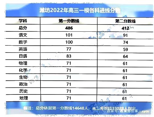 潍坊一模划线及分数排名公布:特招线470分,一段线411分;成绩615分排名200名,587分排名第500,551分排名第2000名,详情如下。