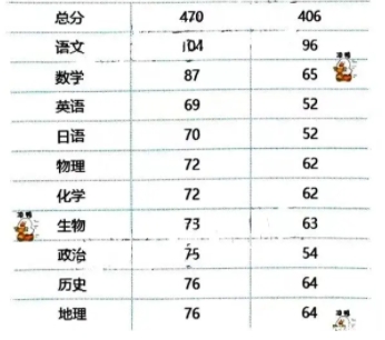 特控线所对应的各科分值:语文数学英语分别是104分、87分和69分,日语是70分、物理和化学是72分、生物是73分、政治是75分、历史和地理是76分。