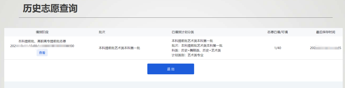 在系统登录页面,选择历史志愿查询项,输入相关信息登录后,可以查看之前填报过的所有志愿信息。