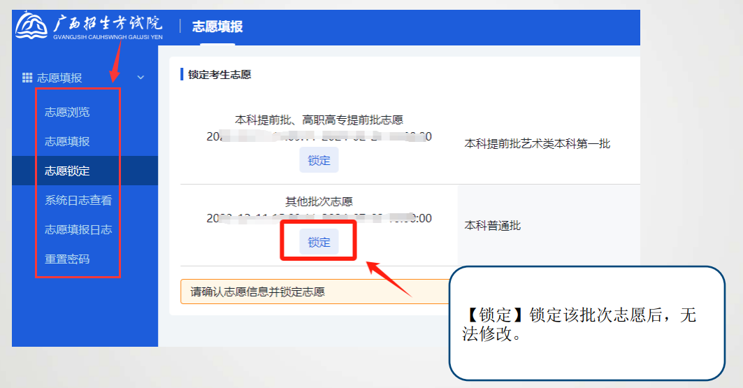 5)如果确认志愿填报无误,可以在“志愿锁定”栏中,将所有批次志愿锁定,锁定后将无法进行修改。