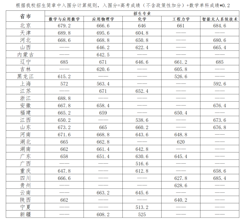 天津:数字与应用数学专业689.8分、应用物理学专业695.6分、化学专业604.8分。