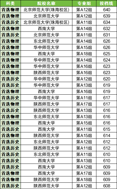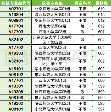 历史类:录取线最低的是东北师范大学01组(不限),分数是597;此外分数较低的还有陕西师范大学02组(598分)、东北师范大学03组(599分)、西南大学01组(600分)。