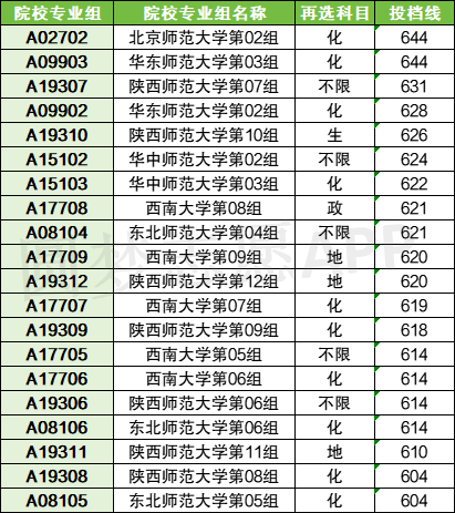 物理类:公费师范的最低录取线是604分,在该分数的专业组共有两个,分别是东北师范大学05组(604分)、陕西师范大学08组(604分)。