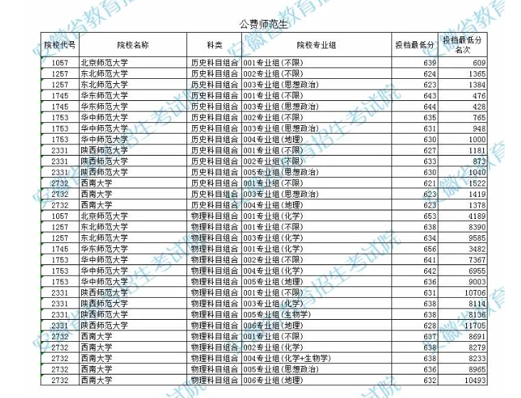 承担国家公费师范生培养任务的一共有6所高校,分别是北京师范大学、东北师范大学、华中师范大学、华东师范大学、陕西师范大学以及西南大学。下面分别为大家整理这6所部属公费师范生院校在全国各省2023年投档录取分数线情况。