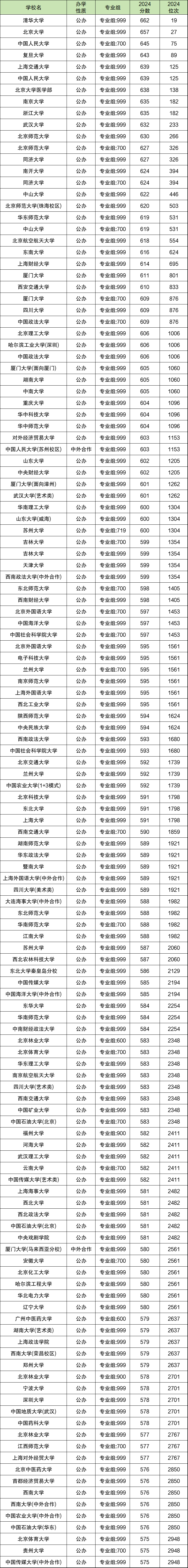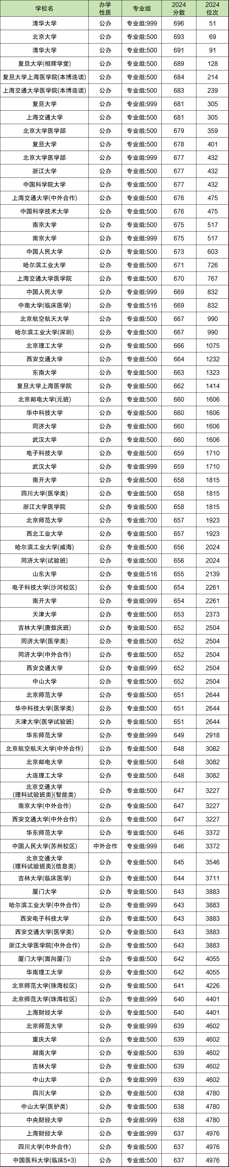 1-5000名中最低位次对应的院校专业组有上海财经大学999组、中国医科大学(临床5+3)500组等3个,最低录取位次为4976位,位次对应分数为637分。