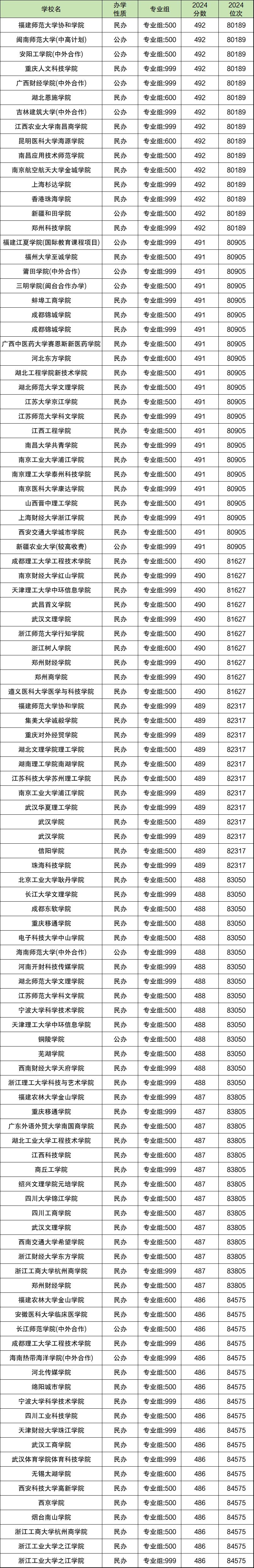 8-万8.5万名中最低位次对应的院校专业组有西安科技大学高新学院500组、无锡太湖学院600组等19个,最低录取位次为84575位,位次对应分数为486分。
