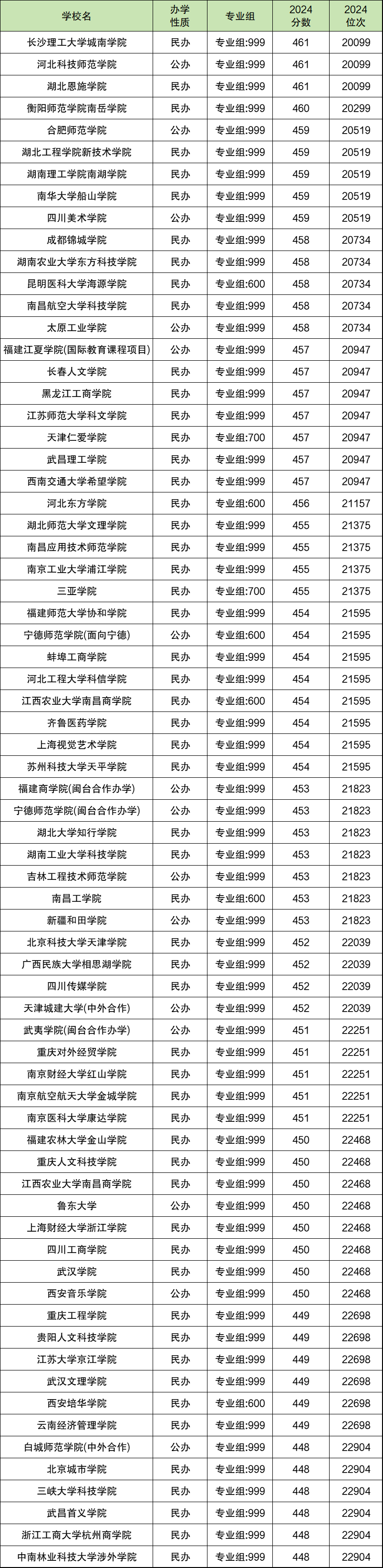 2万-2.3万名中最低位次对应的院校专业组有北京城市学院999组、三峡大学科技学院999组等6个,最低录取位次为22904位,位次对应分数为448分。