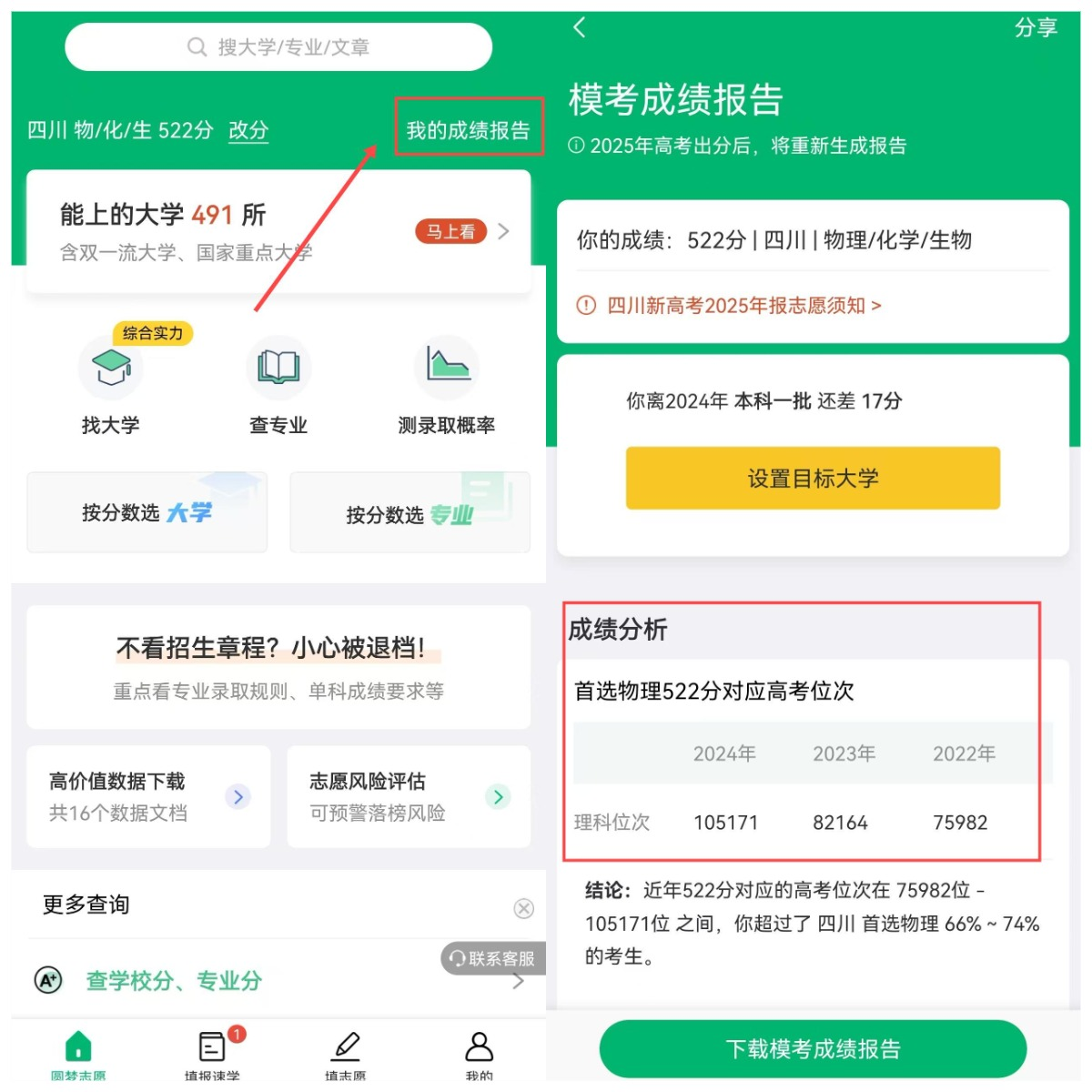 关于考生成绩排名,各省教育考试院都会公布一分一段表,但很多考生并不了解该表应该如何查看,使用圆梦志愿APP就可以帮助大家解决这个问题。考生只需要在圆梦志愿APP首页,输入高考成绩选科以及省份,点击“我的成绩报告”,即可获取自己在全省排名的情况,如图所示:
