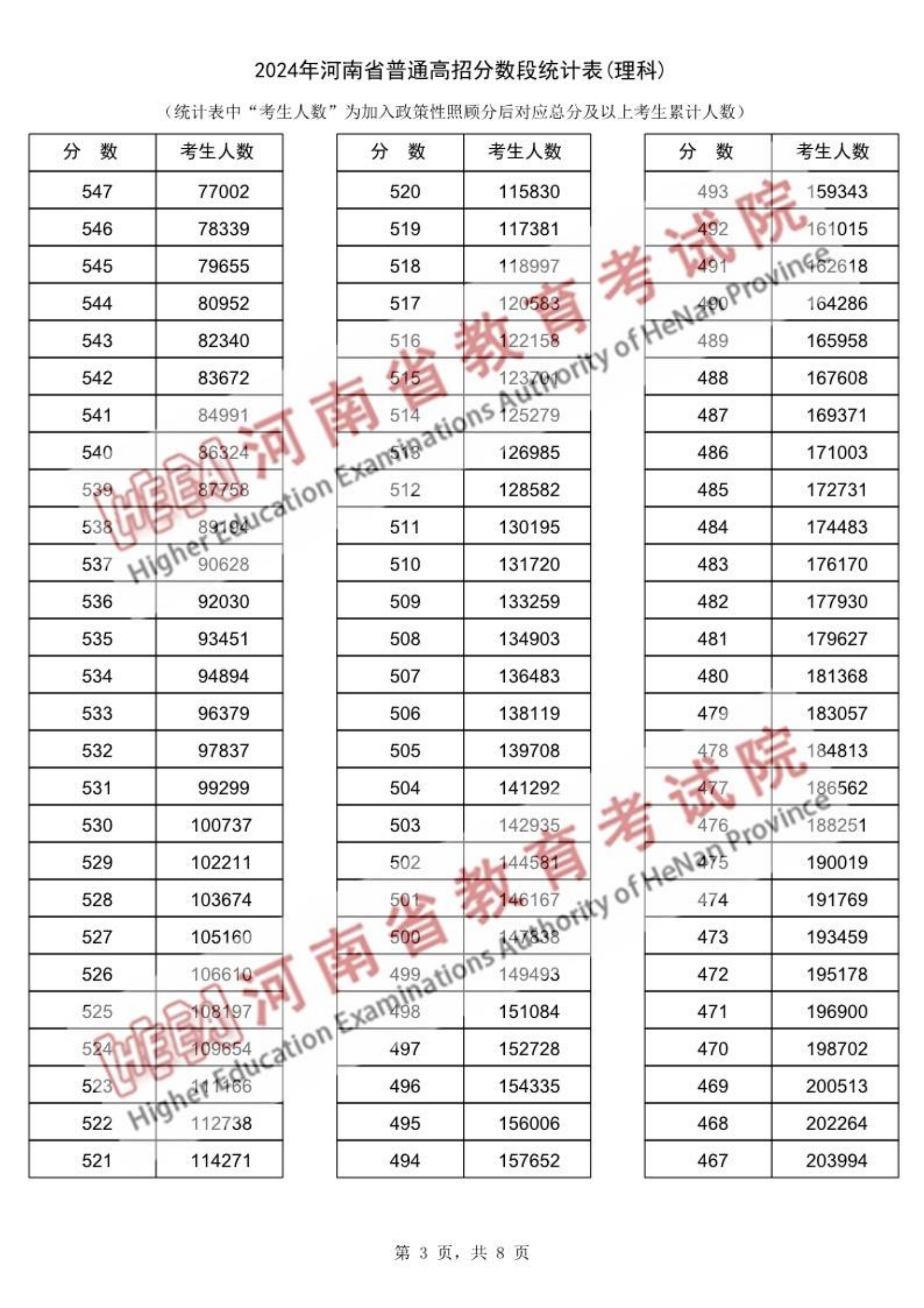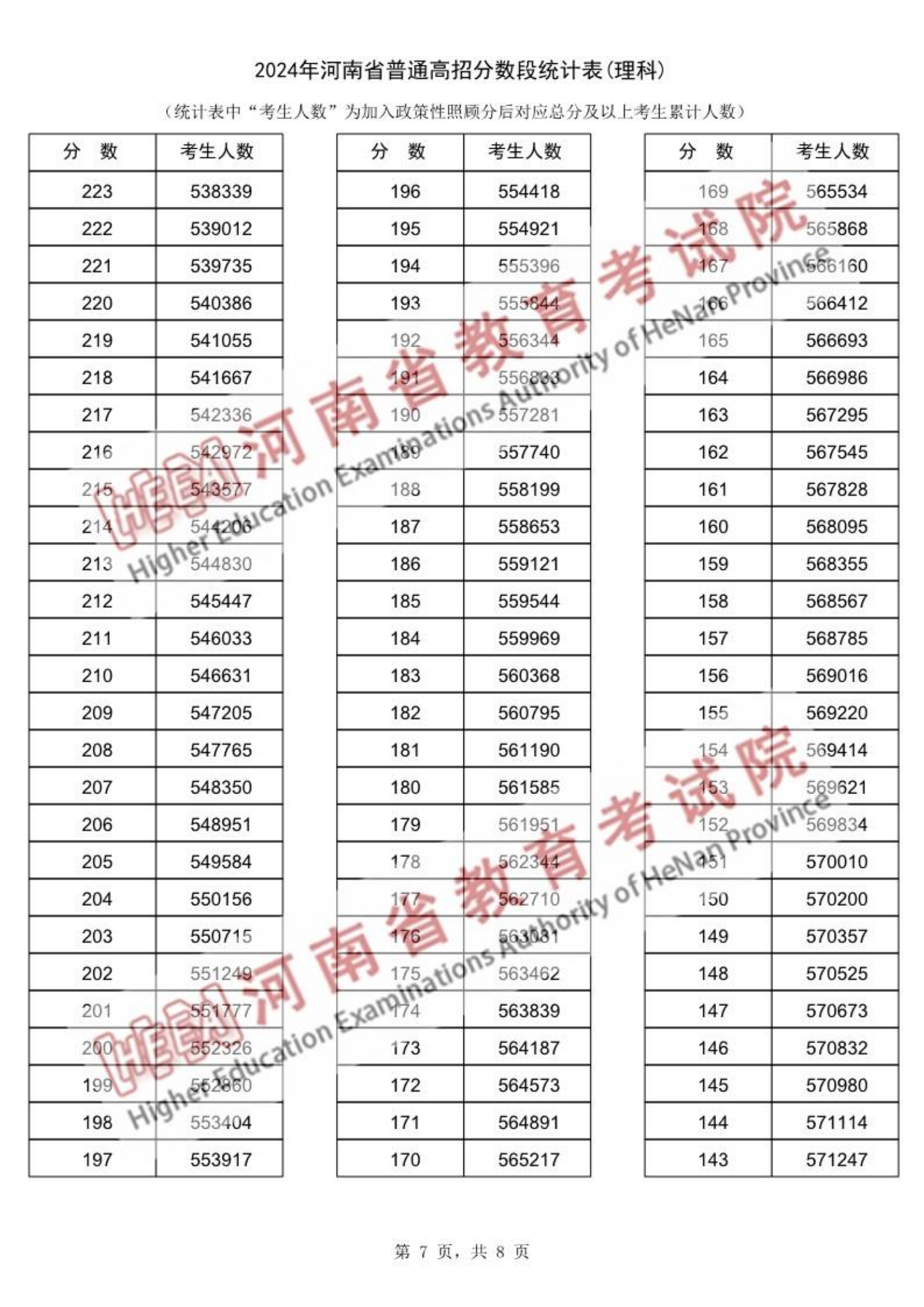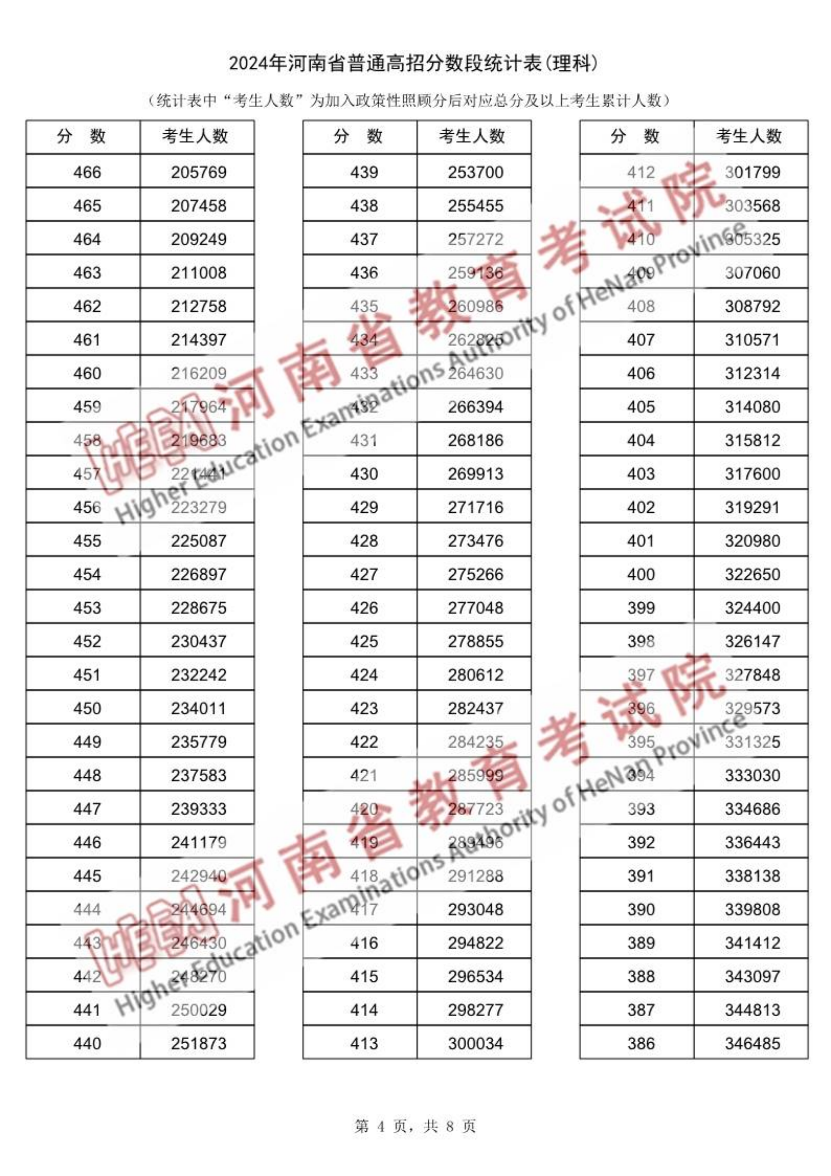2024年河南高考一分一段表(理科、滑动查看):