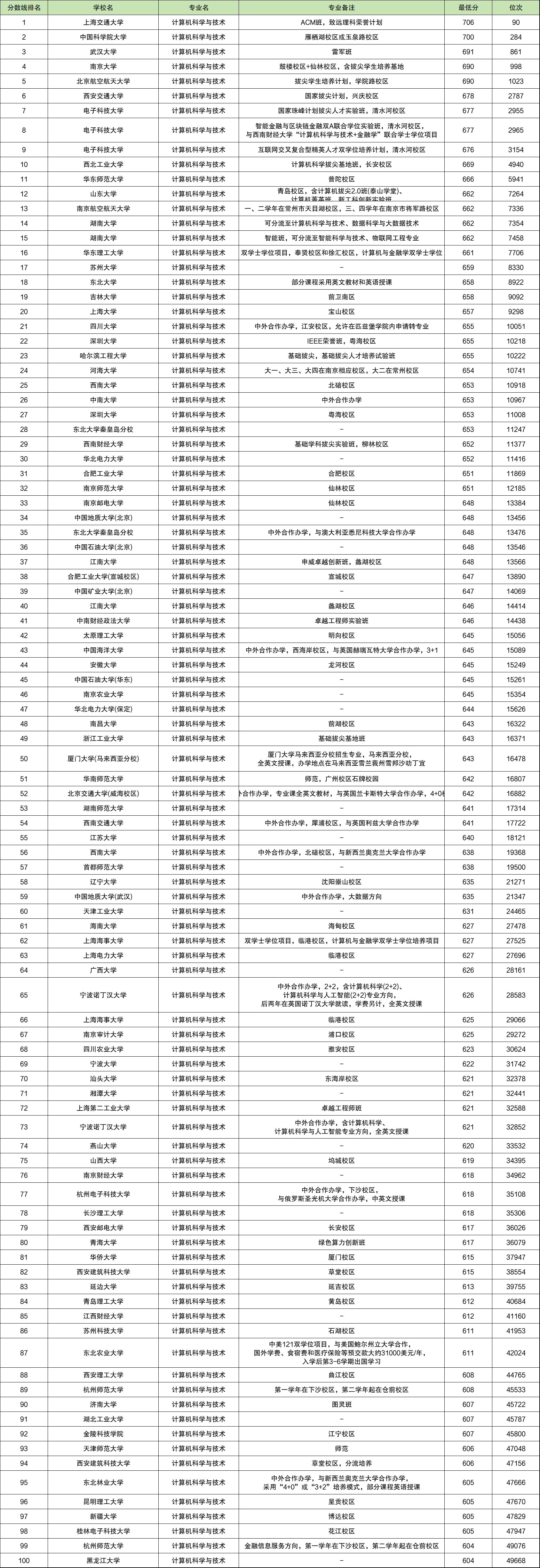 注:由于院校数量较多,本文只整理出分数线排在前100强的院校计算机科学与技术专业录取数据,想了解更详细分数线可以在本文上下方输入分数查看。
