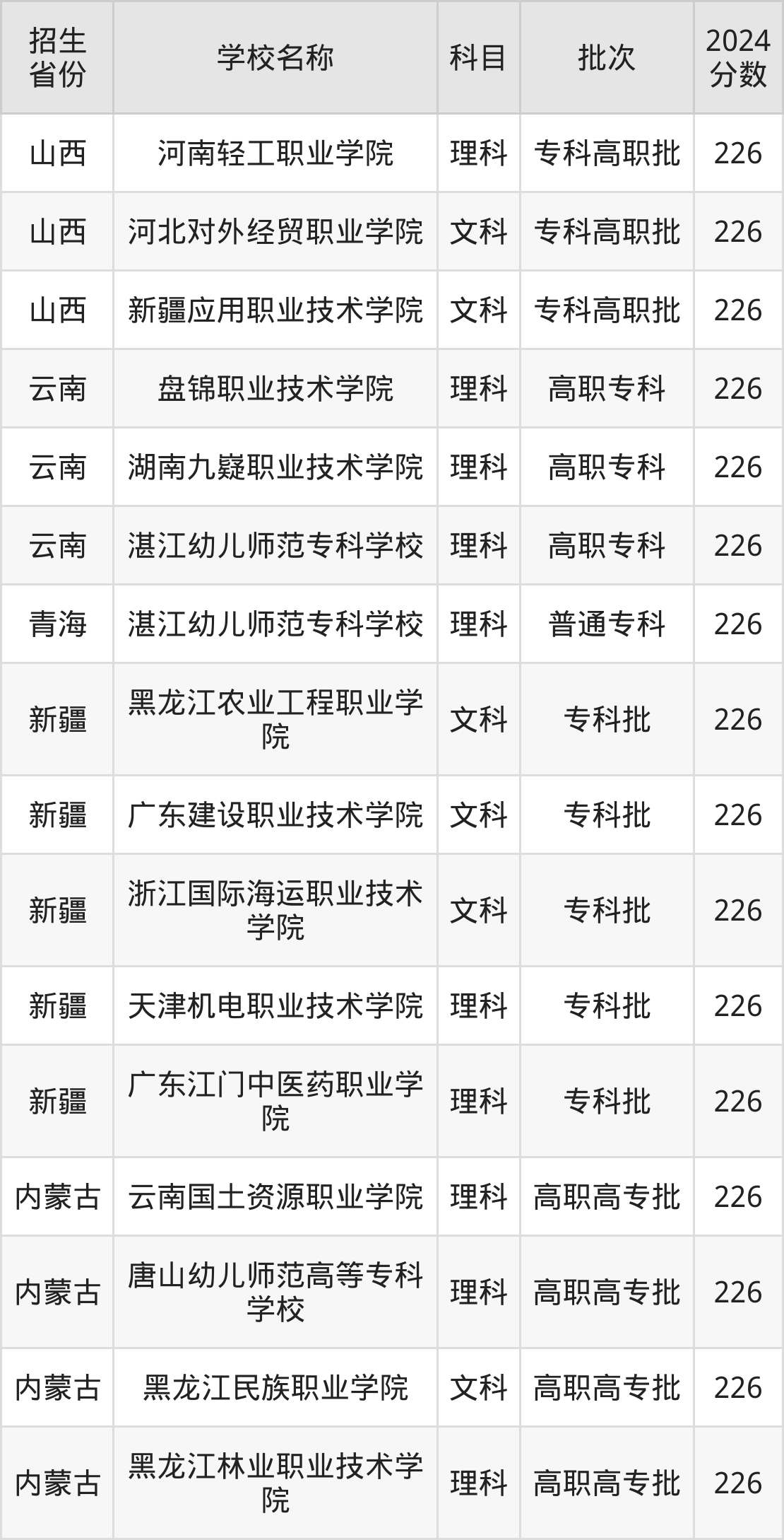 筛选全国各省2024年录取分数线为226分的公办专科大学如下: