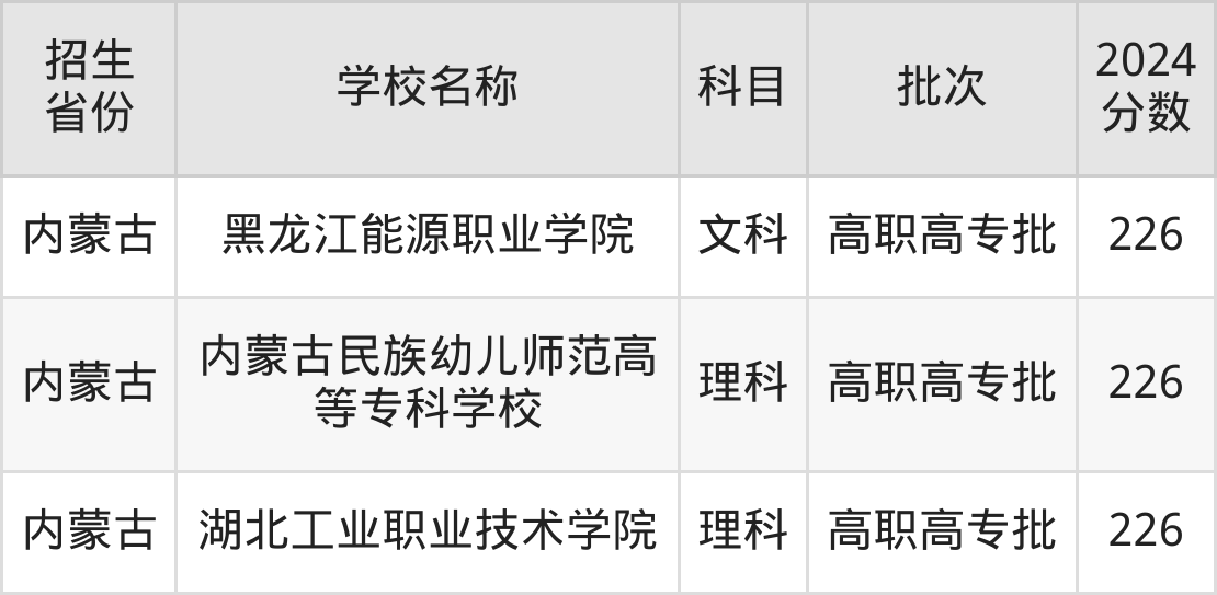 内蒙古自治区文科分数线是226分的公办专科大学有:黑龙江民族职业学院、黑龙江能源职业学院。