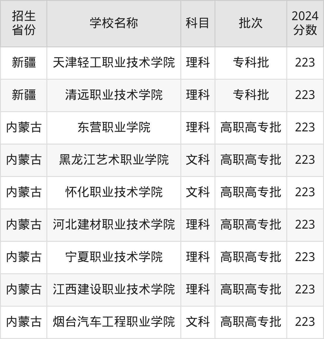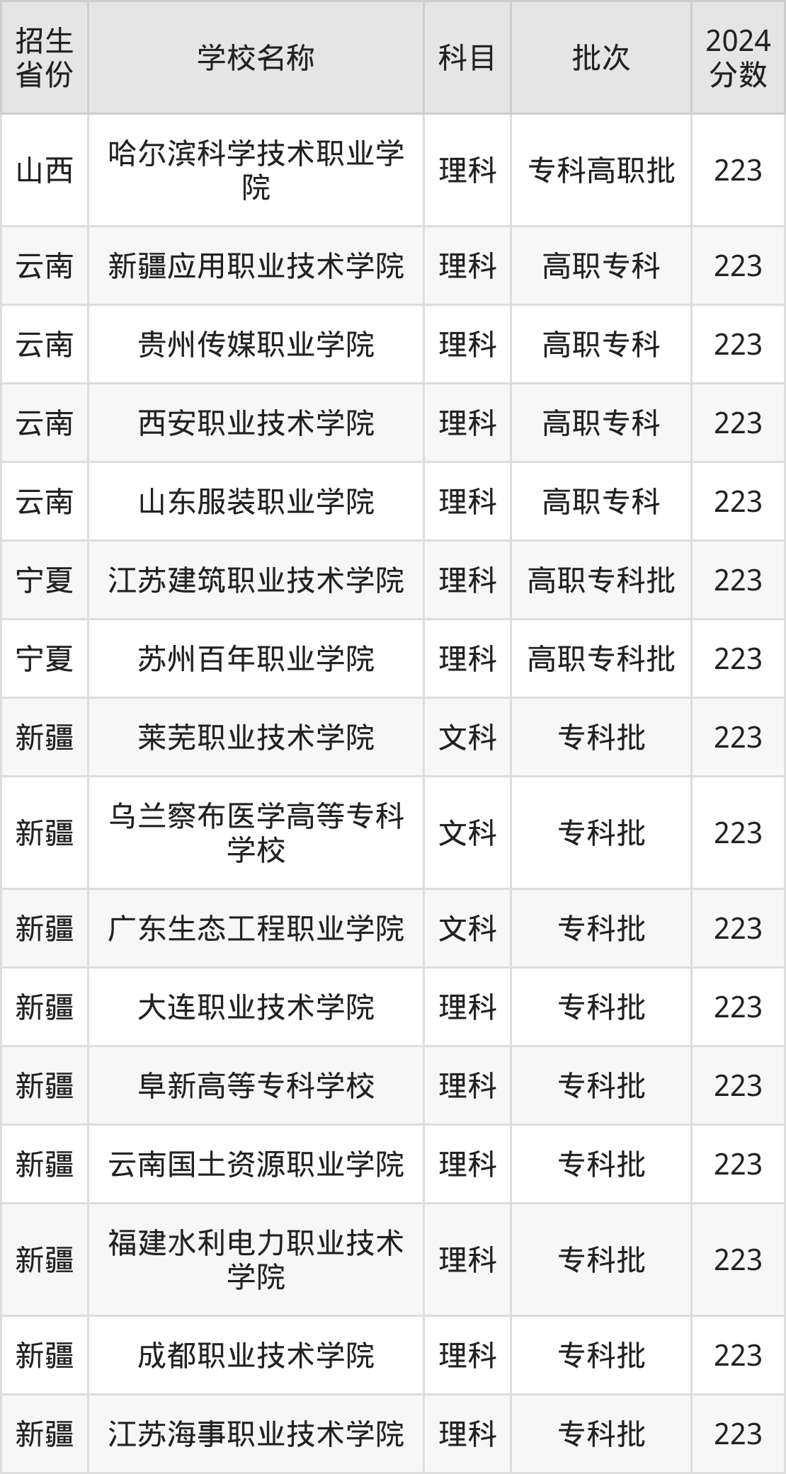 筛选全国各省2024年录取分数线为223分的公办专科大学如下:
