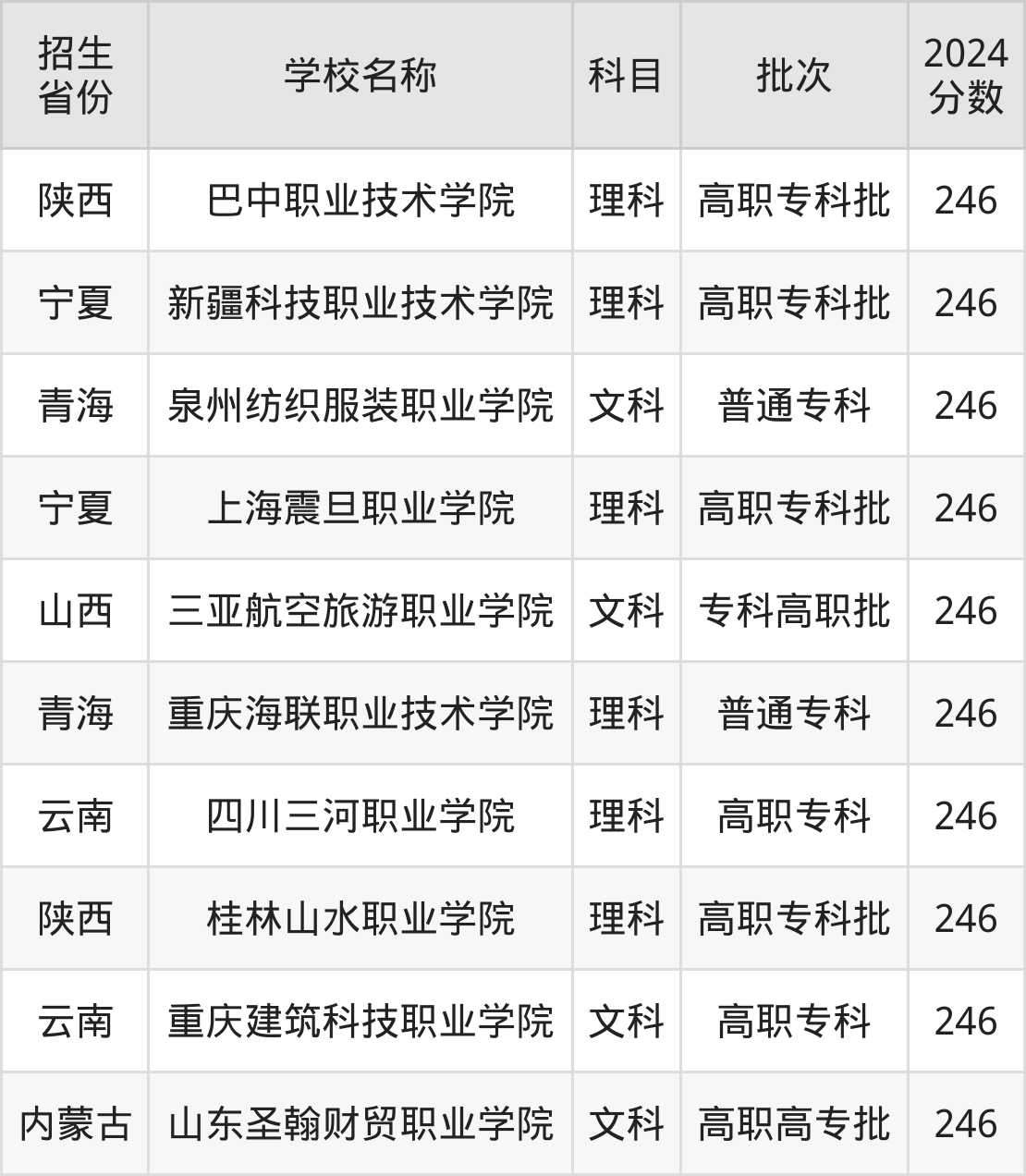 筛选全国各省2024年录取分数线为246分的民办专科学校如下: