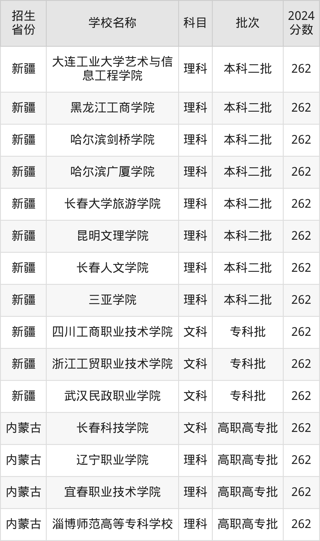 筛选全国各省2024年录取分数线为262分的文科大学如下: