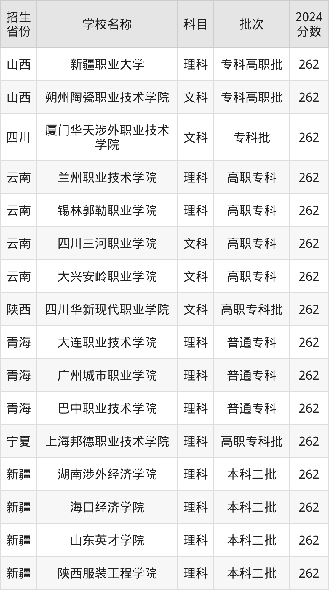 山西省理科分数线是262分的文科大学有:新疆职业大学。