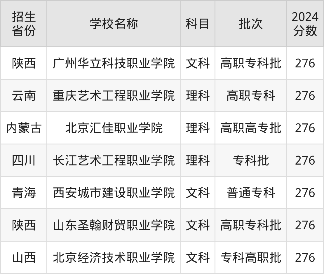 筛选全国各省2024年录取分数线为276分的民办专科学校如下: