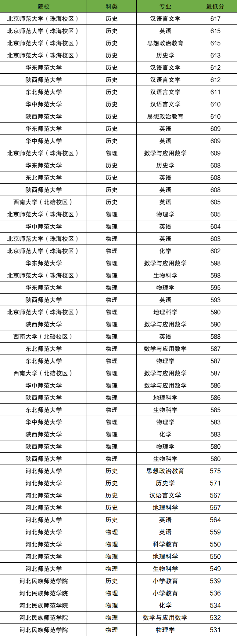 其中在历史科目类中收分最高的大学为北京师范大学(珠海校区)汉语言文学专业,2024年最低投档线为617分;收分最低的优师专项计划院校为河北民族师范学院小学教育专业,2024年最低投档线为539分。