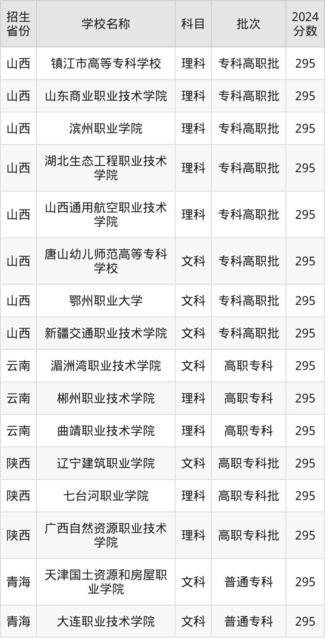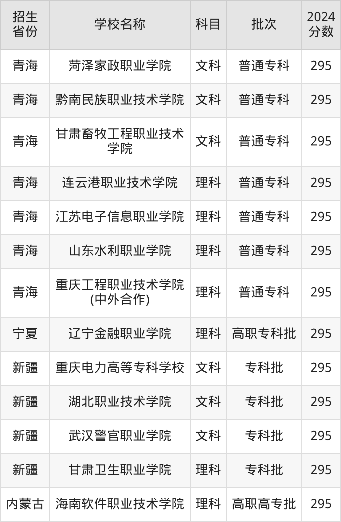 筛选全国各省2024年录取分数线为295分的公办专科大学如下: