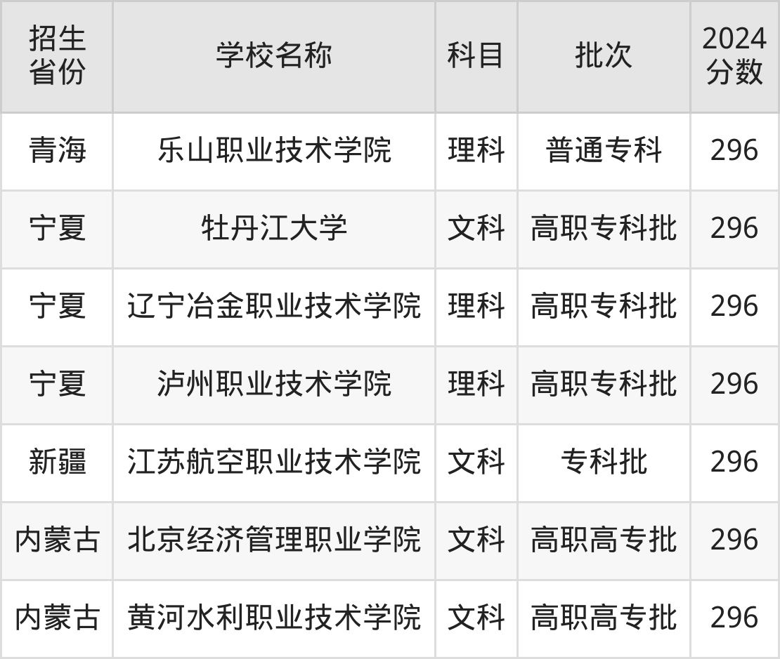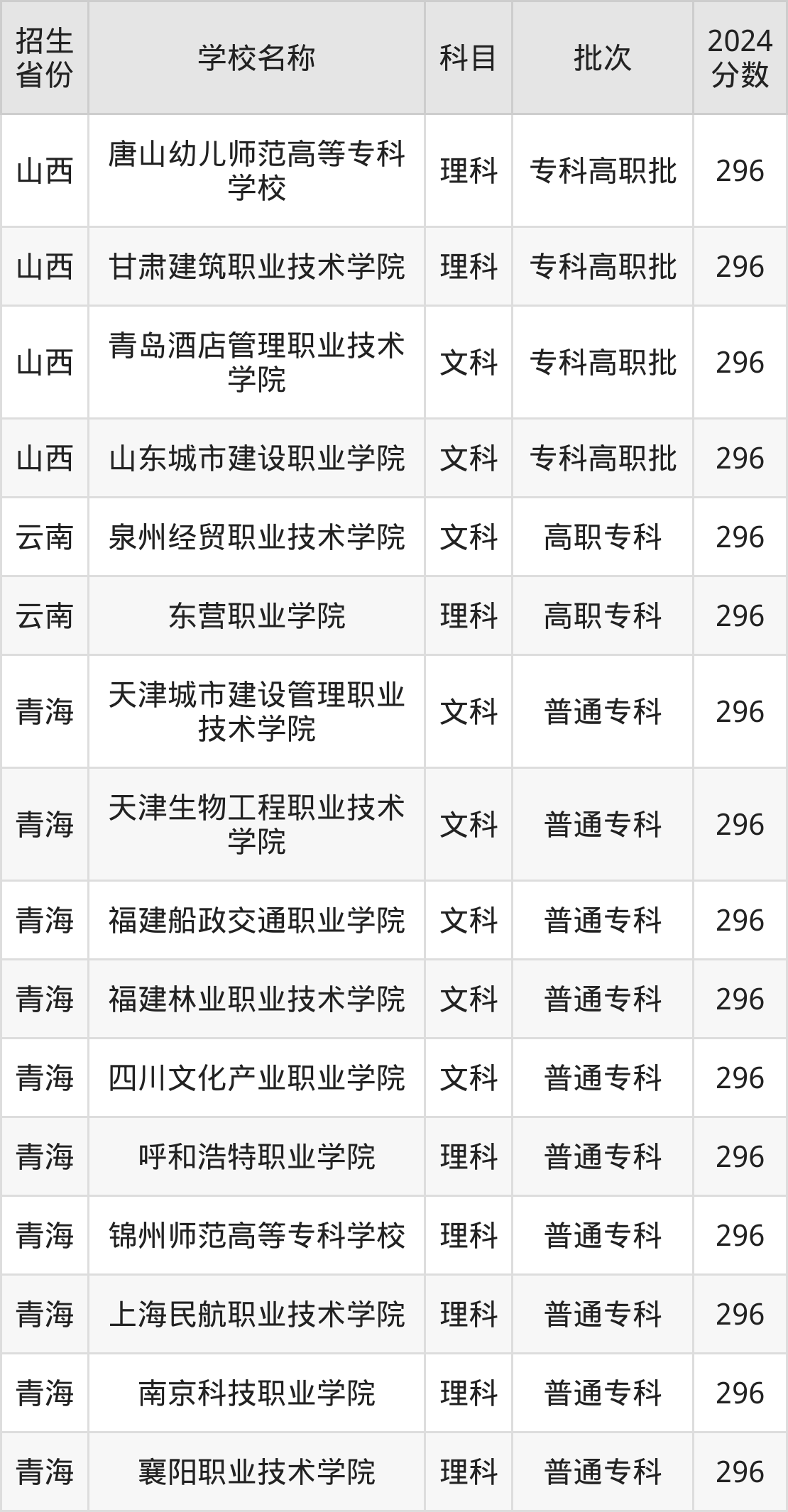 筛选全国各省2024年录取分数线为296分的公办专科大学如下: