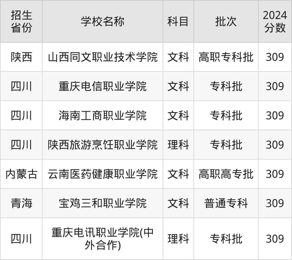 四川省文科分数线是309分的民办专科学校有:重庆电信职业学院、海南工商职业学院。