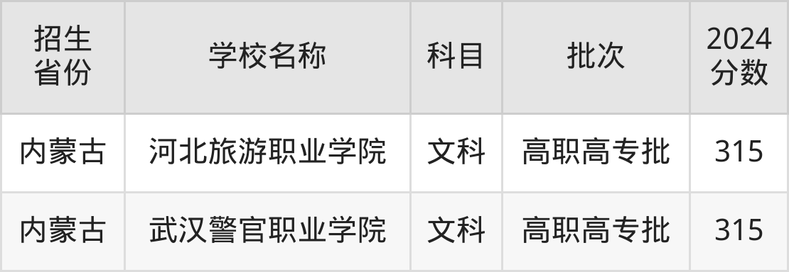 内蒙古自治区文科分数线是315分的公办专科大学有:山东中医药高等专科学校、天津市职业大学、河北旅游职业学院、武汉警官职业学院。