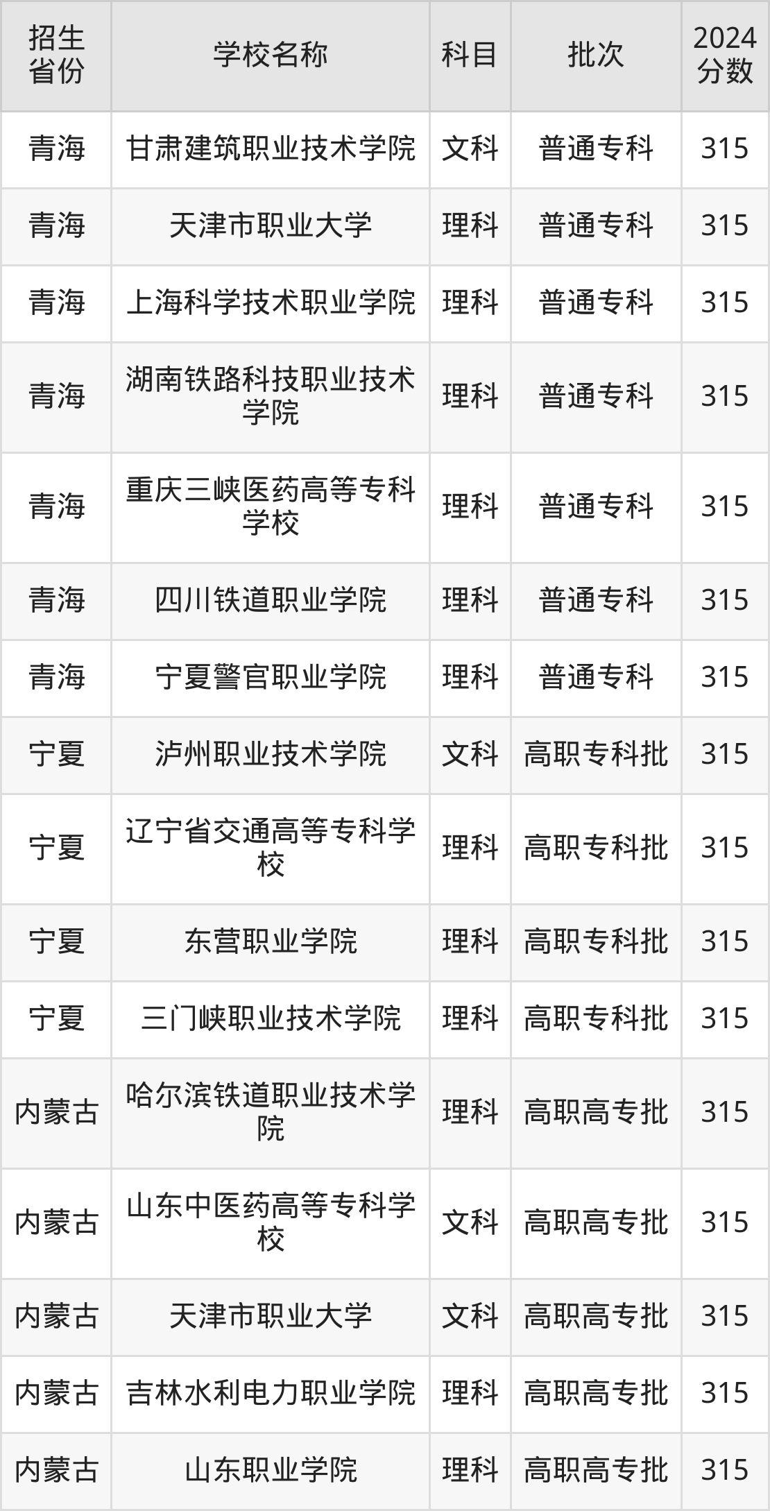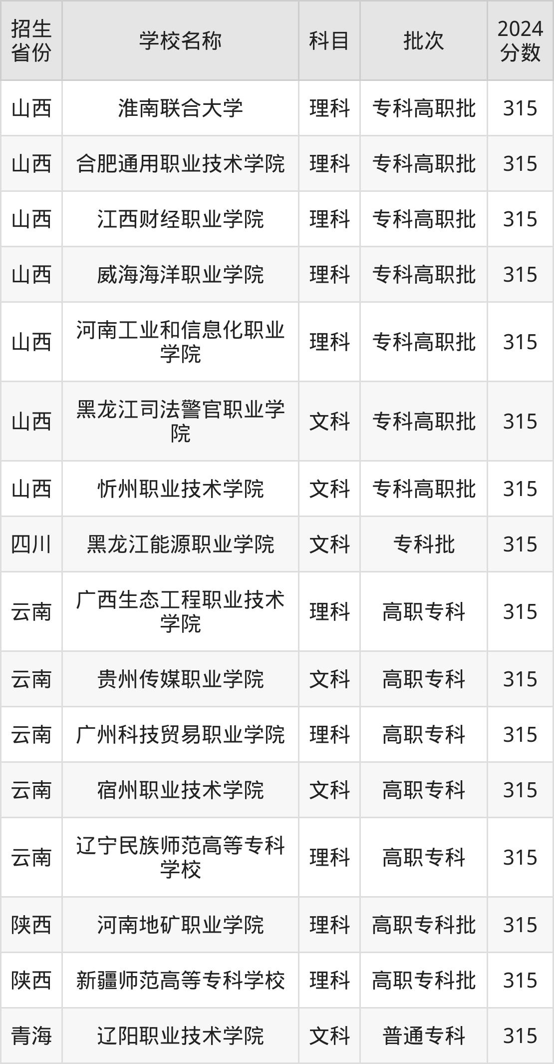 筛选全国各省2024年录取分数线为315分的公办专科大学如下: