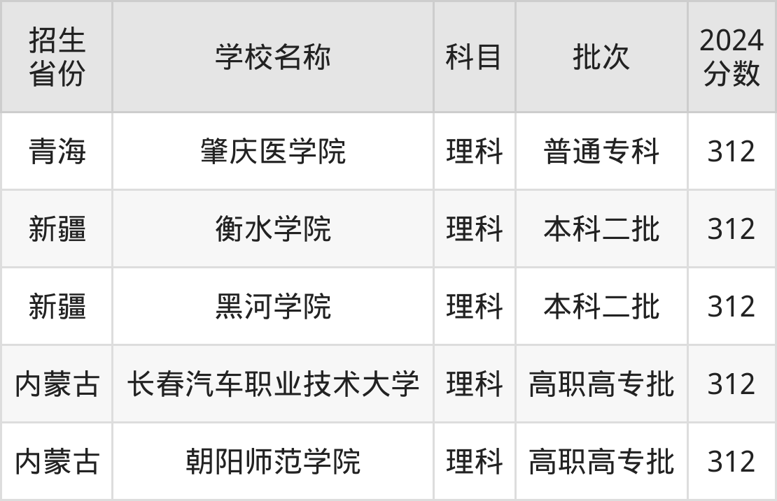 青海省理科分数线是312分的二本公办大学有:肇庆医学院。