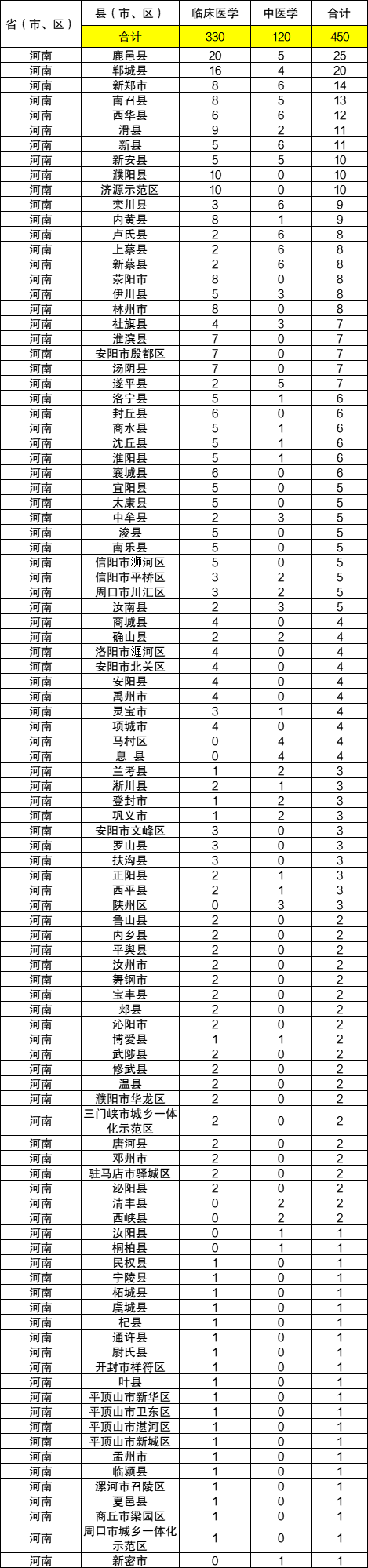 西华县:共计12人,其中临床医学6人,中医学6人。