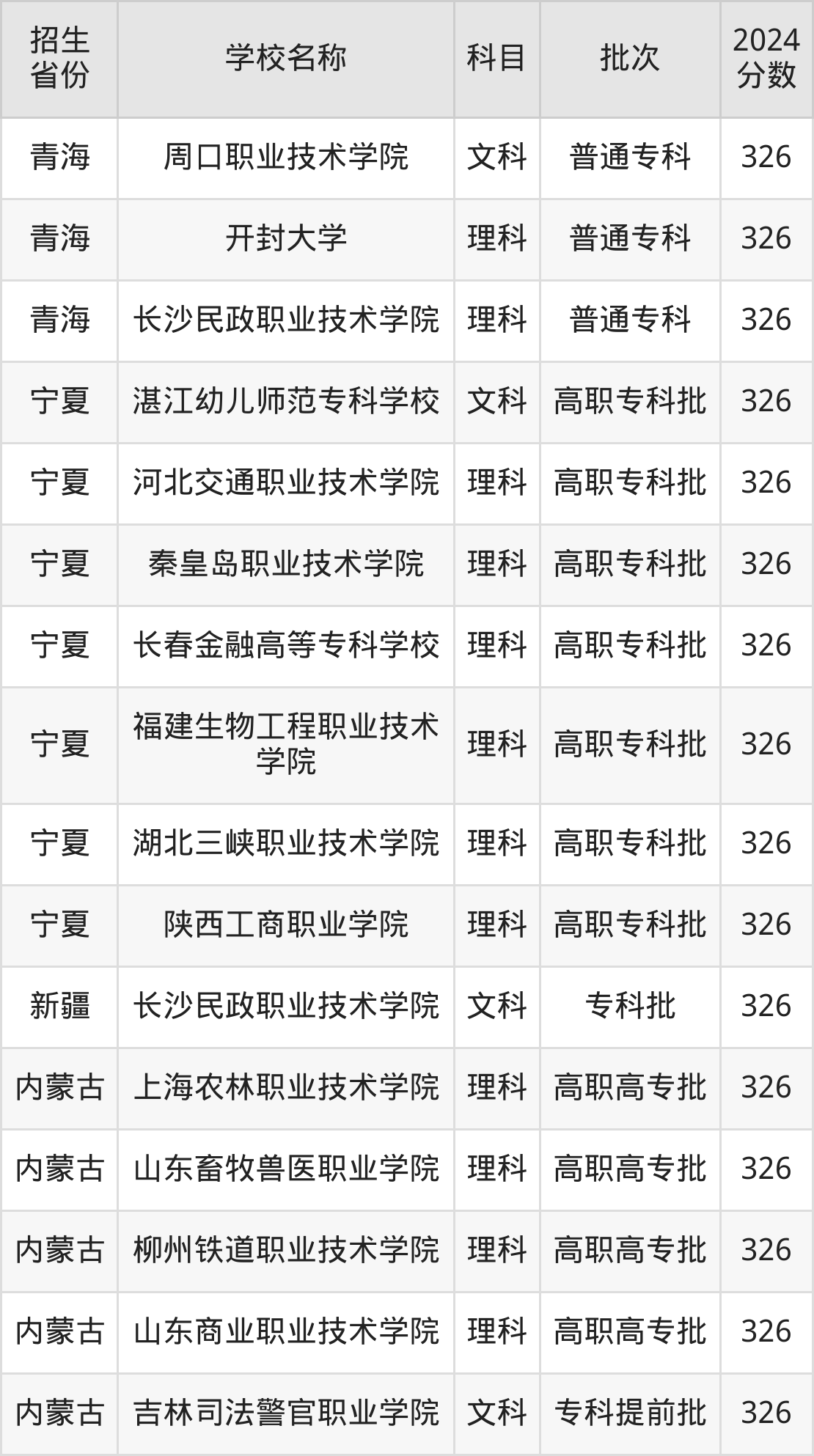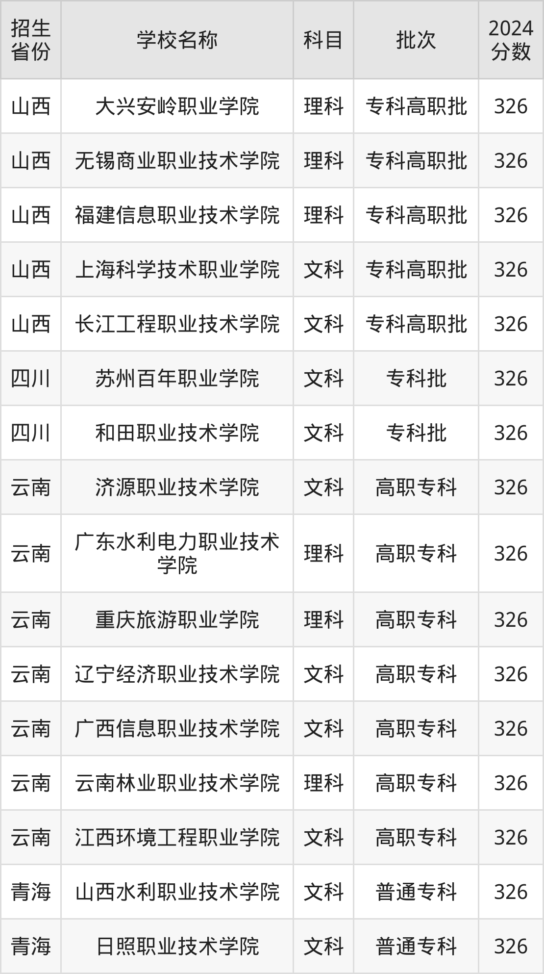 筛选全国各省2024年录取分数线为326分的公办专科大学如下: