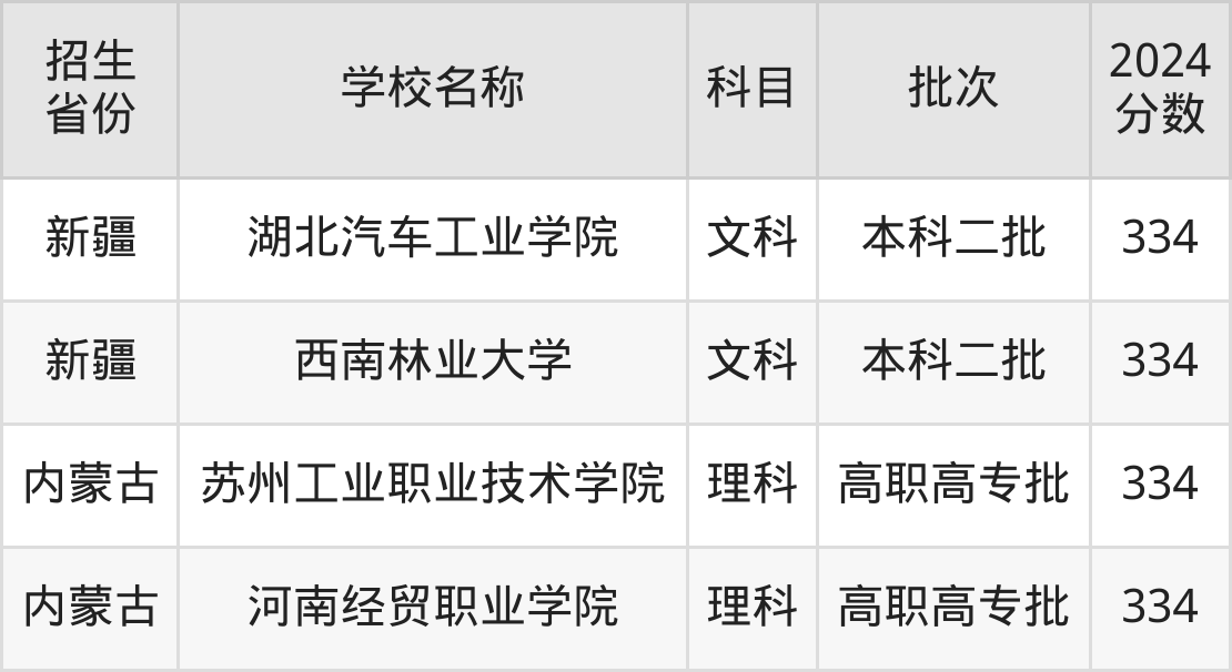新疆维吾尔自治区文科分数线是334分的理科大学有:湖北汽车工业学院、西南林业大学。