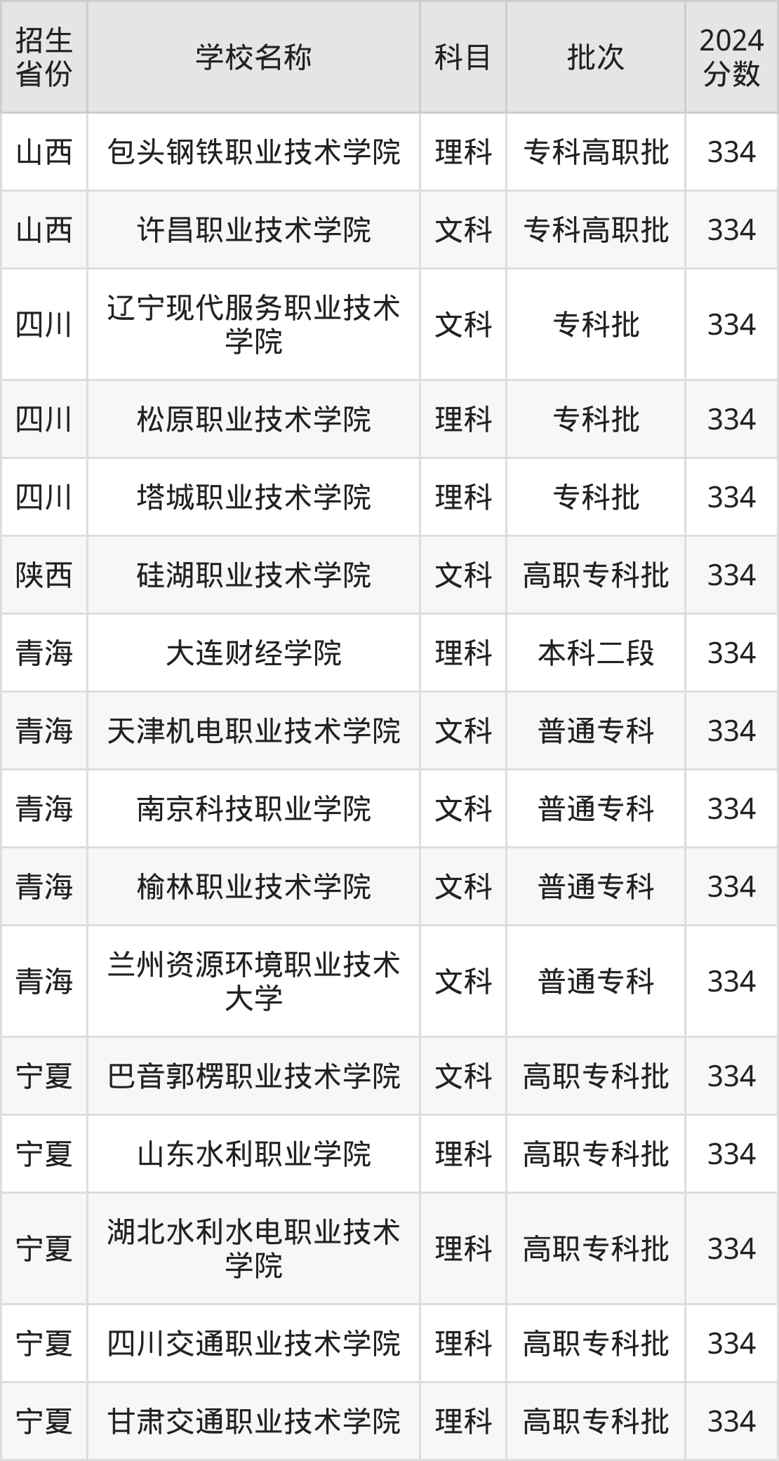 青海省文科分数线是334分的理科大学有:天津机电职业技术学院、南京科技职业学院、榆林职业技术学院、兰州资源环境职业技术大学。