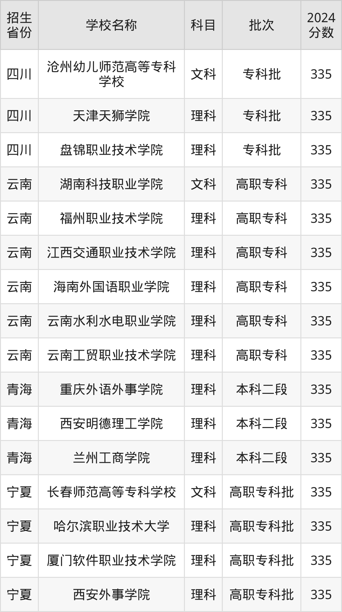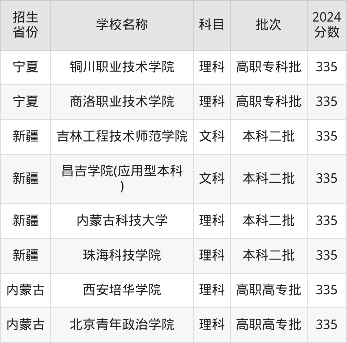 宁夏回族自治区理科分数线是335分的文科大学有:哈尔滨职业技术大学、厦门软件职业技术学院、西安外事学院、铜川职业技术学院、商洛职业技术学院。
