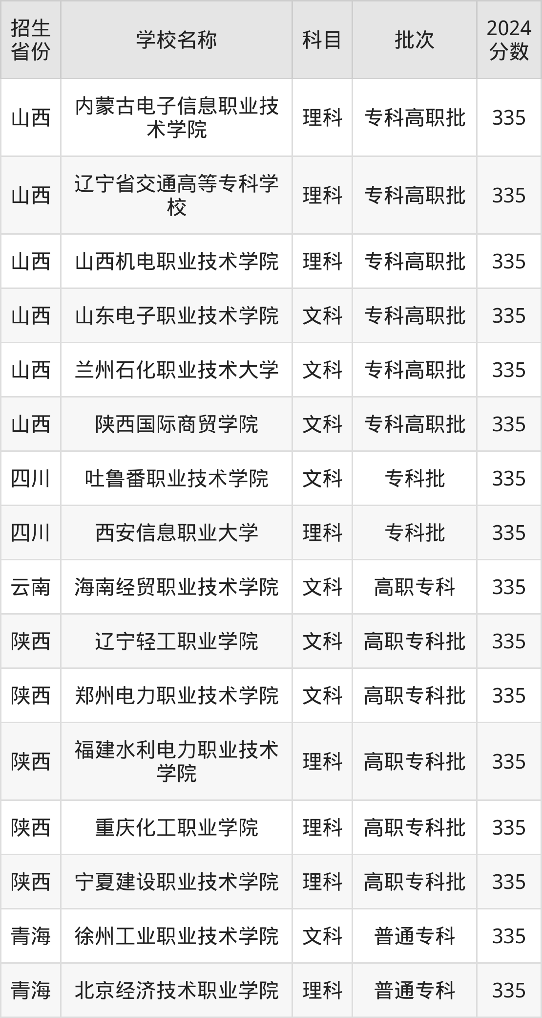 山西省理科分数线是335分的理科大学有:内蒙古电子信息职业技术学院、辽宁省交通高等专科学校、山西机电职业技术学院。