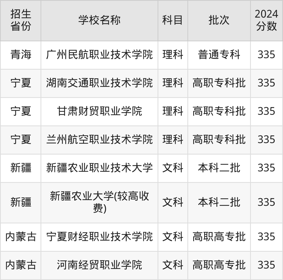 宁夏回族自治区理科分数线是335分的理科大学有:湖南交通职业技术学院、甘肃财贸职业学院、兰州航空职业技术学院。
