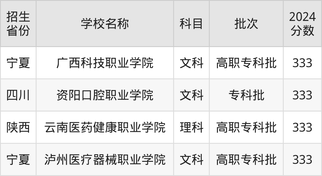 宁夏回族自治区文科分数线是333分的民办专科学校有:广西科技职业学院、泸州医疗器械职业学院。