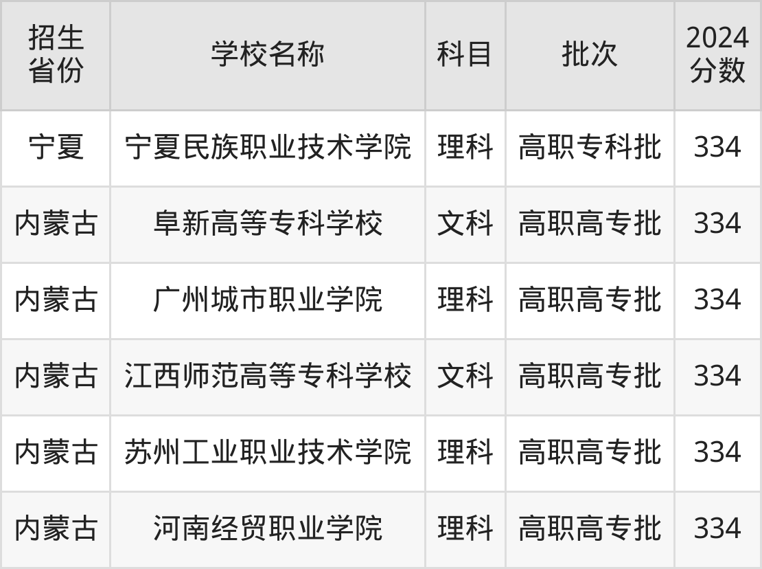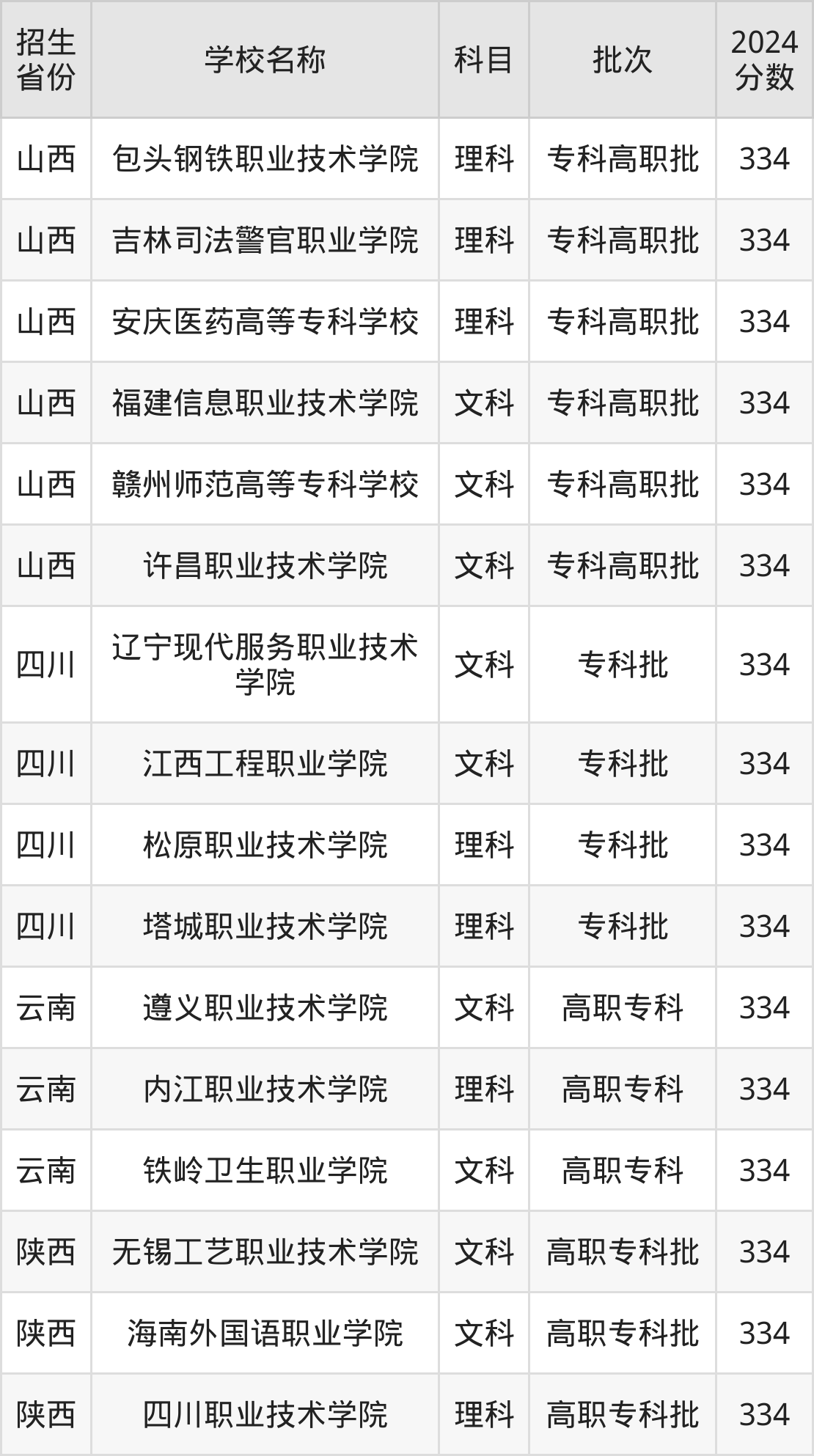 筛选全国各省2024年录取分数线为334分的公办专科大学如下: