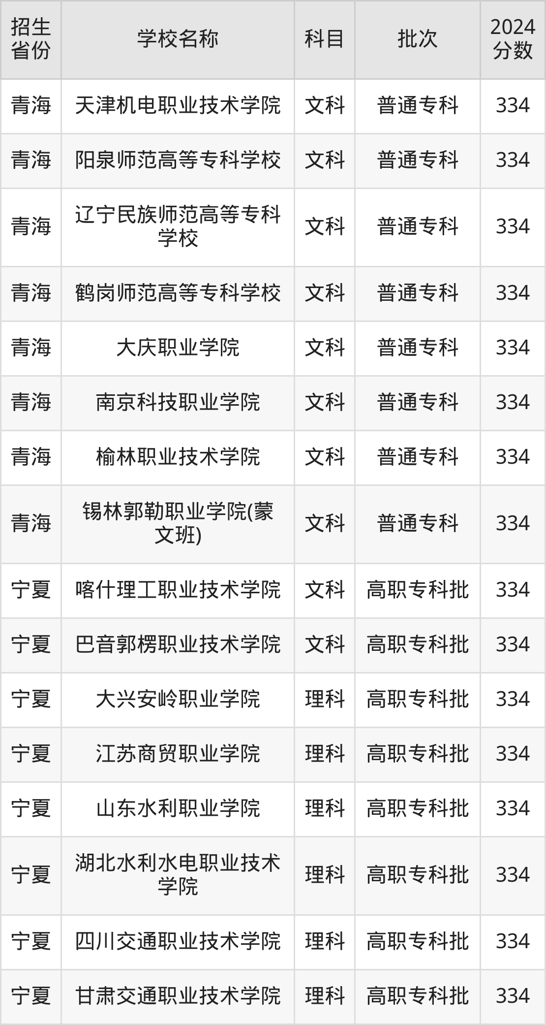 宁夏回族自治区理科分数线是334分的公办专科大学有:大兴安岭职业学院、江苏商贸职业学院、山东水利职业学院、湖北水利水电职业技术学院、四川交通职业技术学院、甘肃交通职业技术学院、宁夏民族职业技术学院。