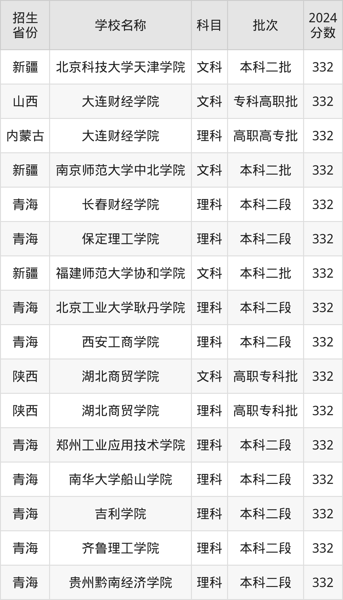 332分可以上的大学有北京科技大学天津学院、大连财经学院、南京师范大学中北学院、长春财经学院等二本民办大学。本文整理了青海、新疆等全国332分左右的二本民办大学名单,请2025年高考生参考。