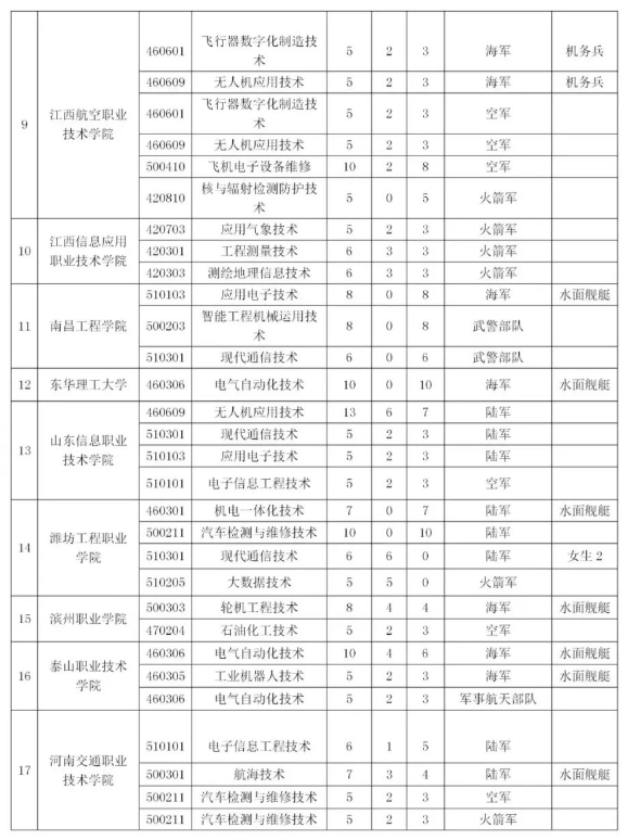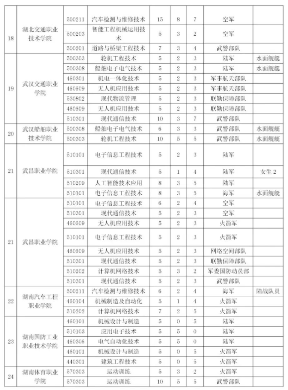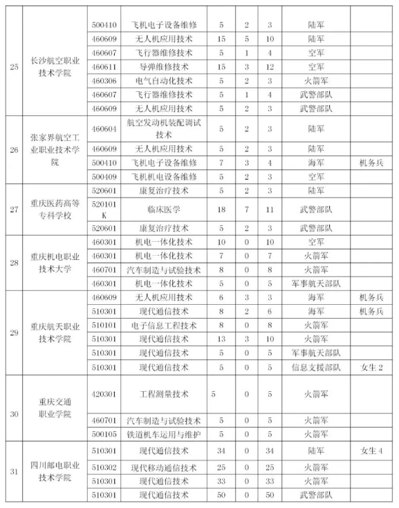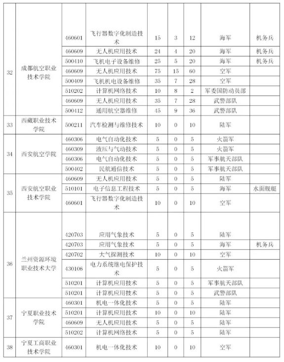 2024年四川定向士官招生计划总计1274人,包含女军士10人;面向四川省招生的定向士官学校有38所,四川本省定向士官学校有2所,为成都航空职业技术学院和四川邮电职业技术学院。