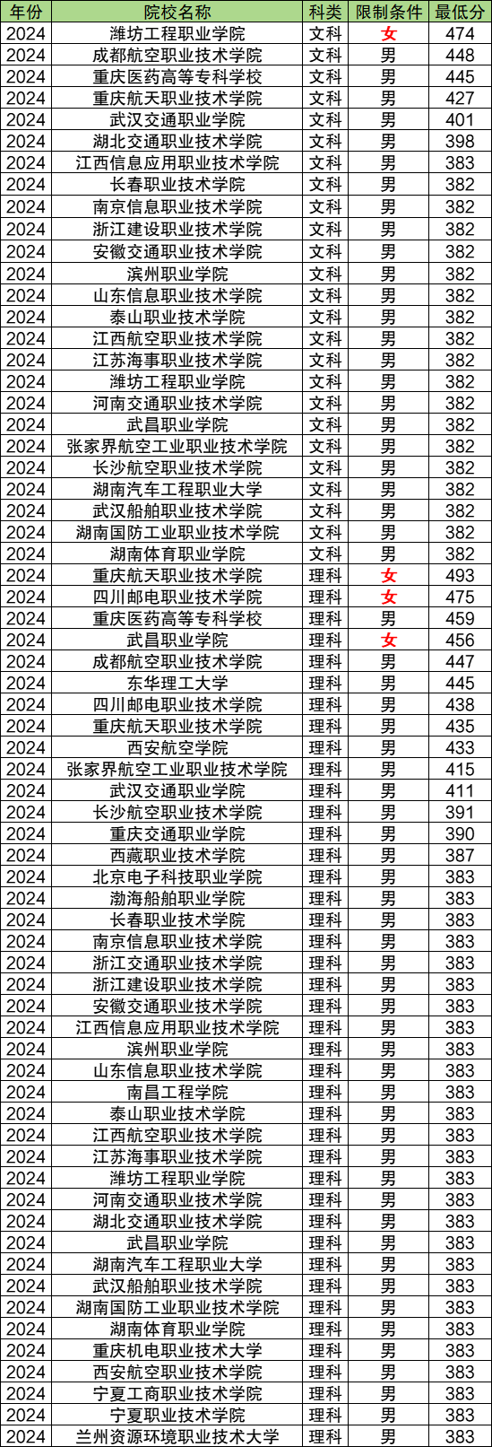而招生对象为女生,录取分数线最高的定向士官学校是重庆航天职业技术学院,最低分为493分;录取分数线最低的定向士官学校是武昌职业学院,最低分为456分。