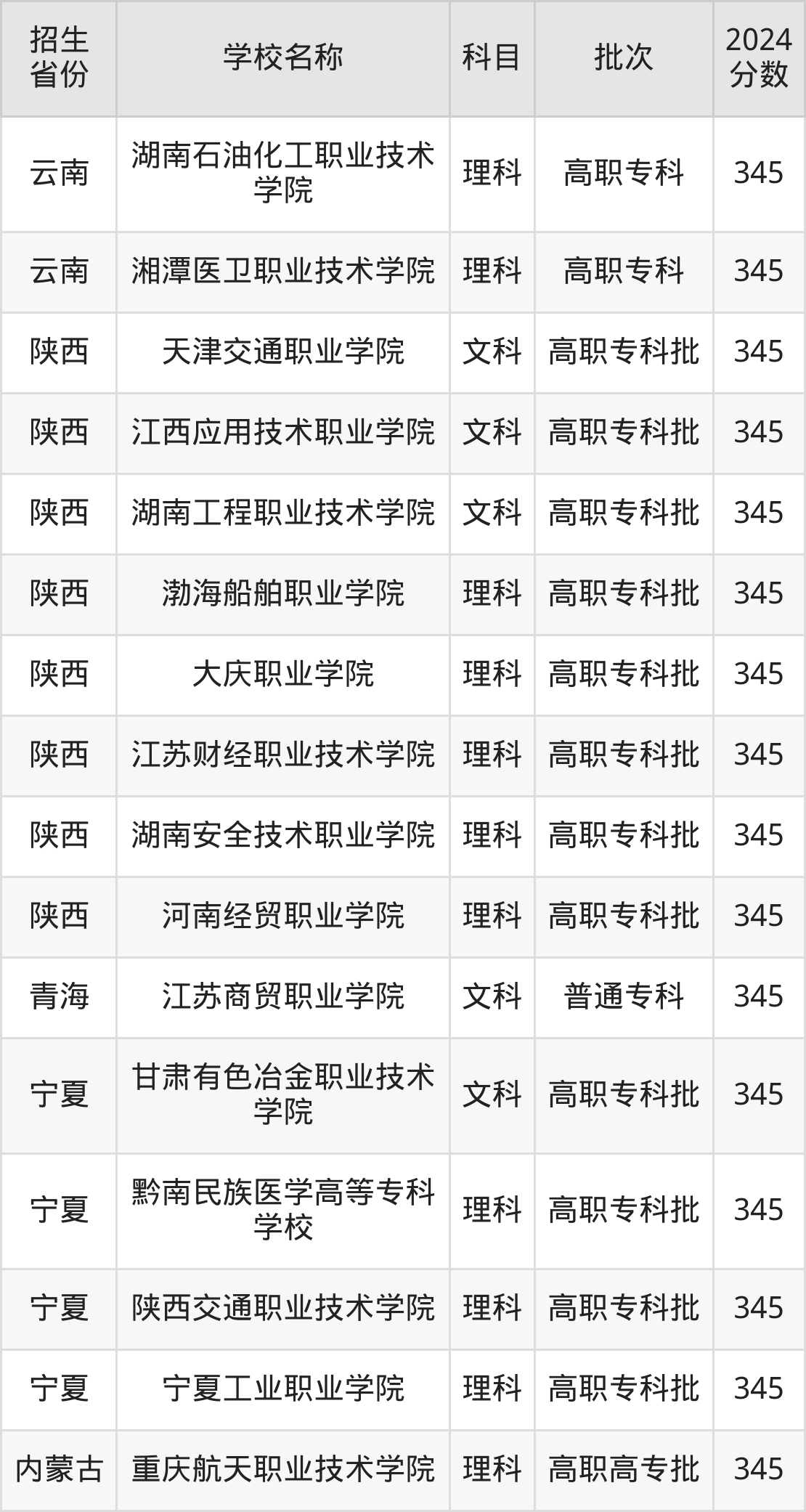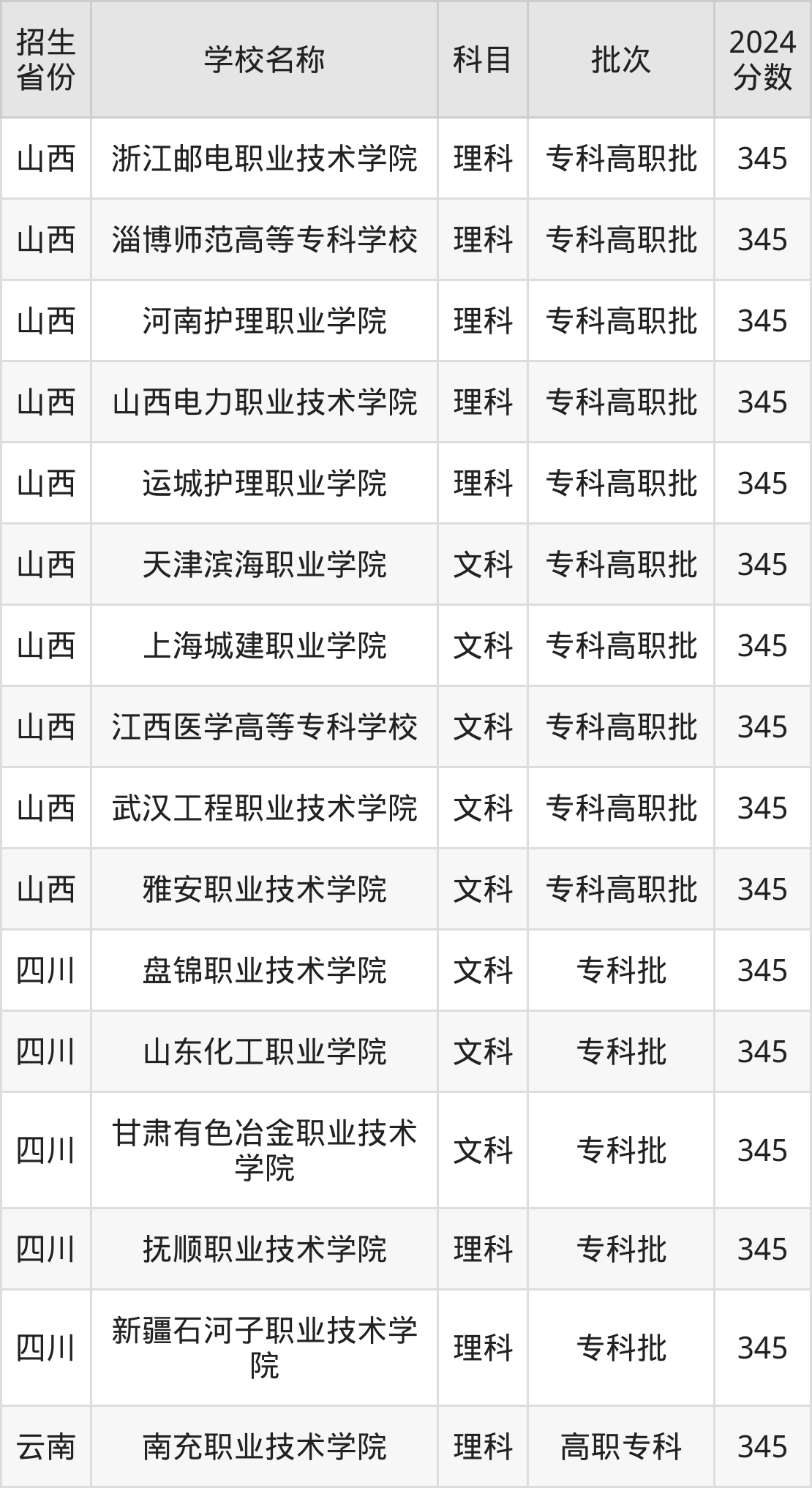 筛选全国各省2024年录取分数线为345分的公办专科大学如下: