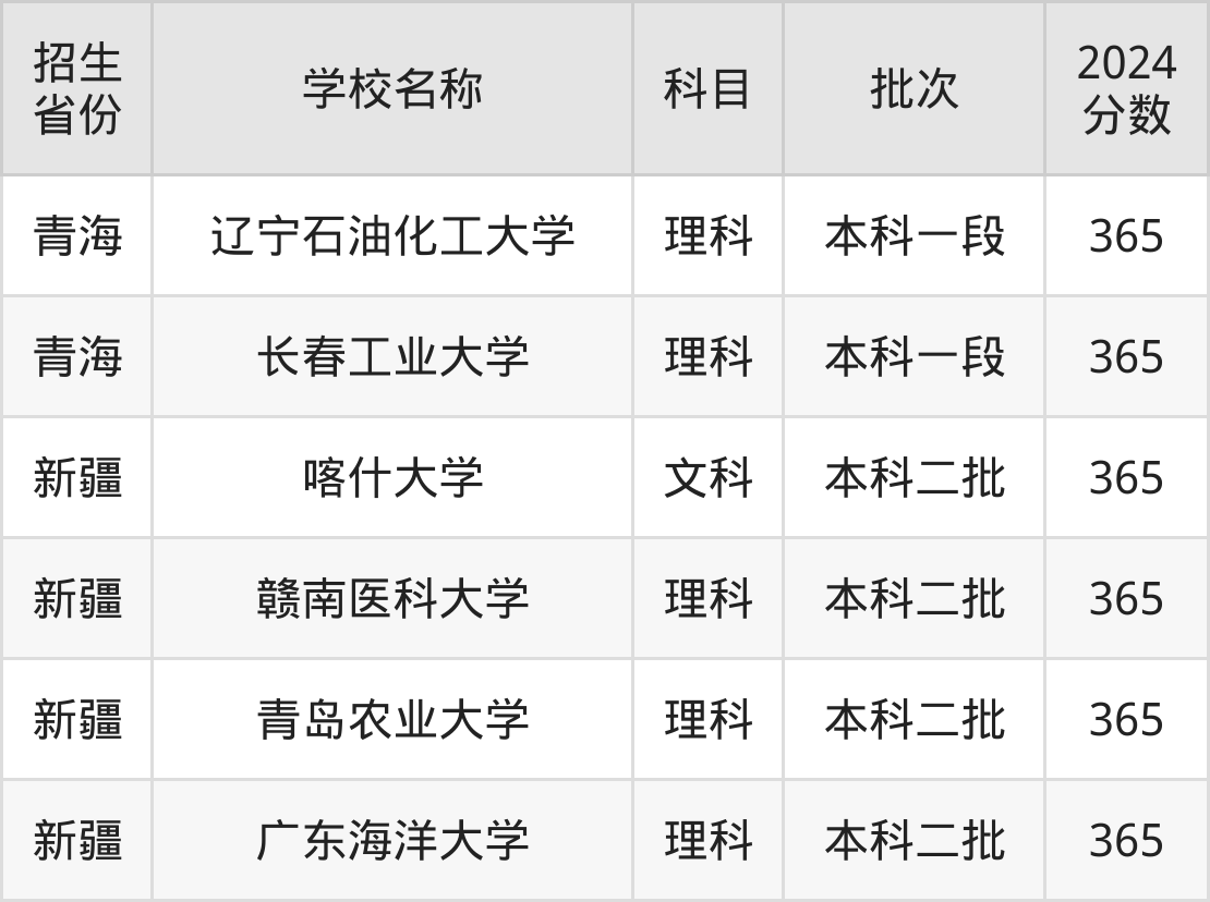 筛选全国各省2024年录取分数线为365分的一本大学如下: