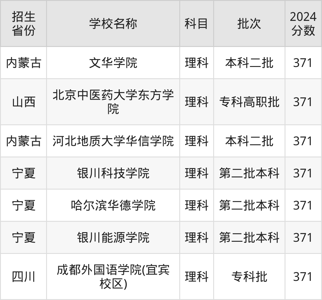筛选全国各省2024年录取分数线为371分的二本民办大学如下: