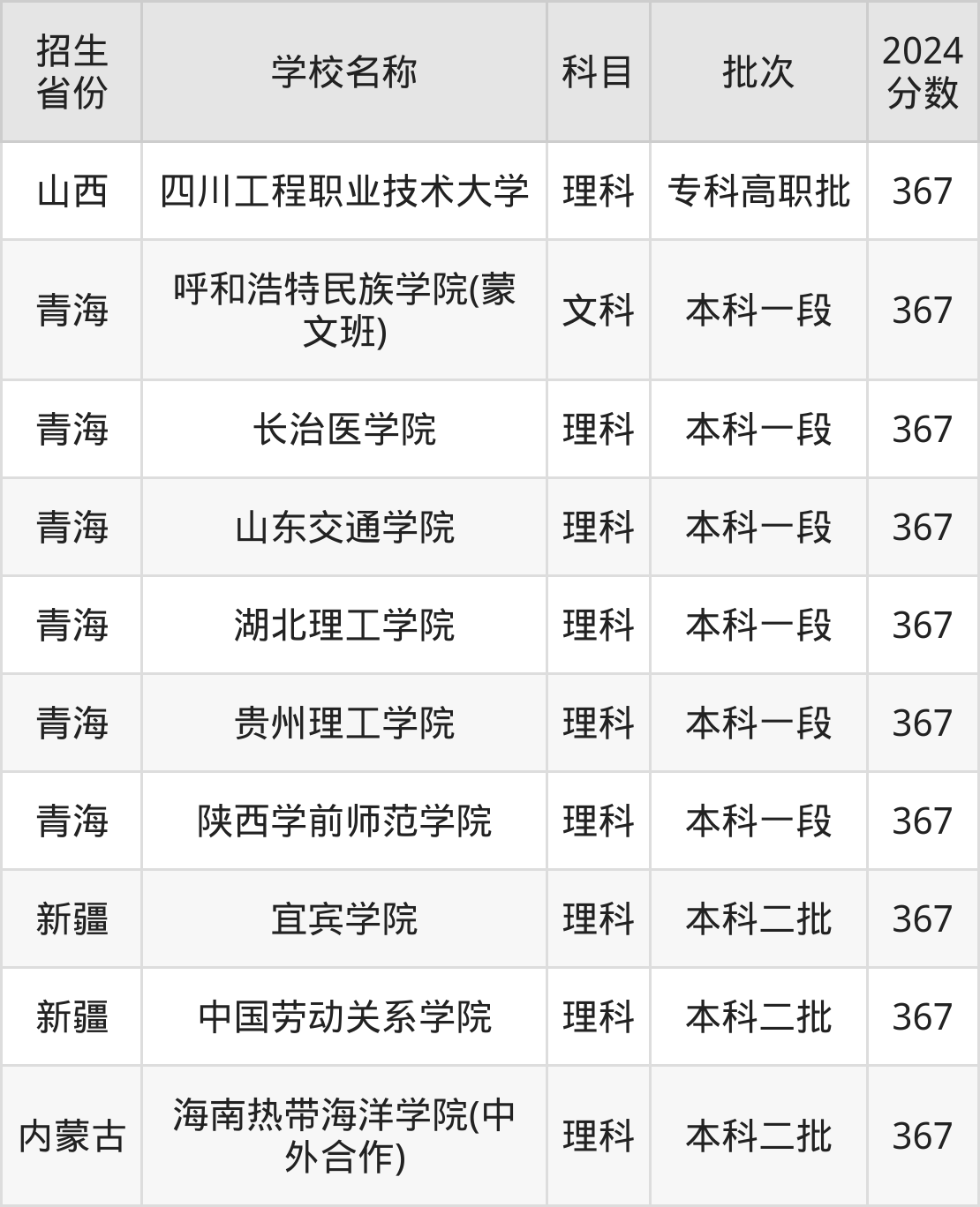 筛选全国各省2024年录取分数线为367分的二本公办大学如下: