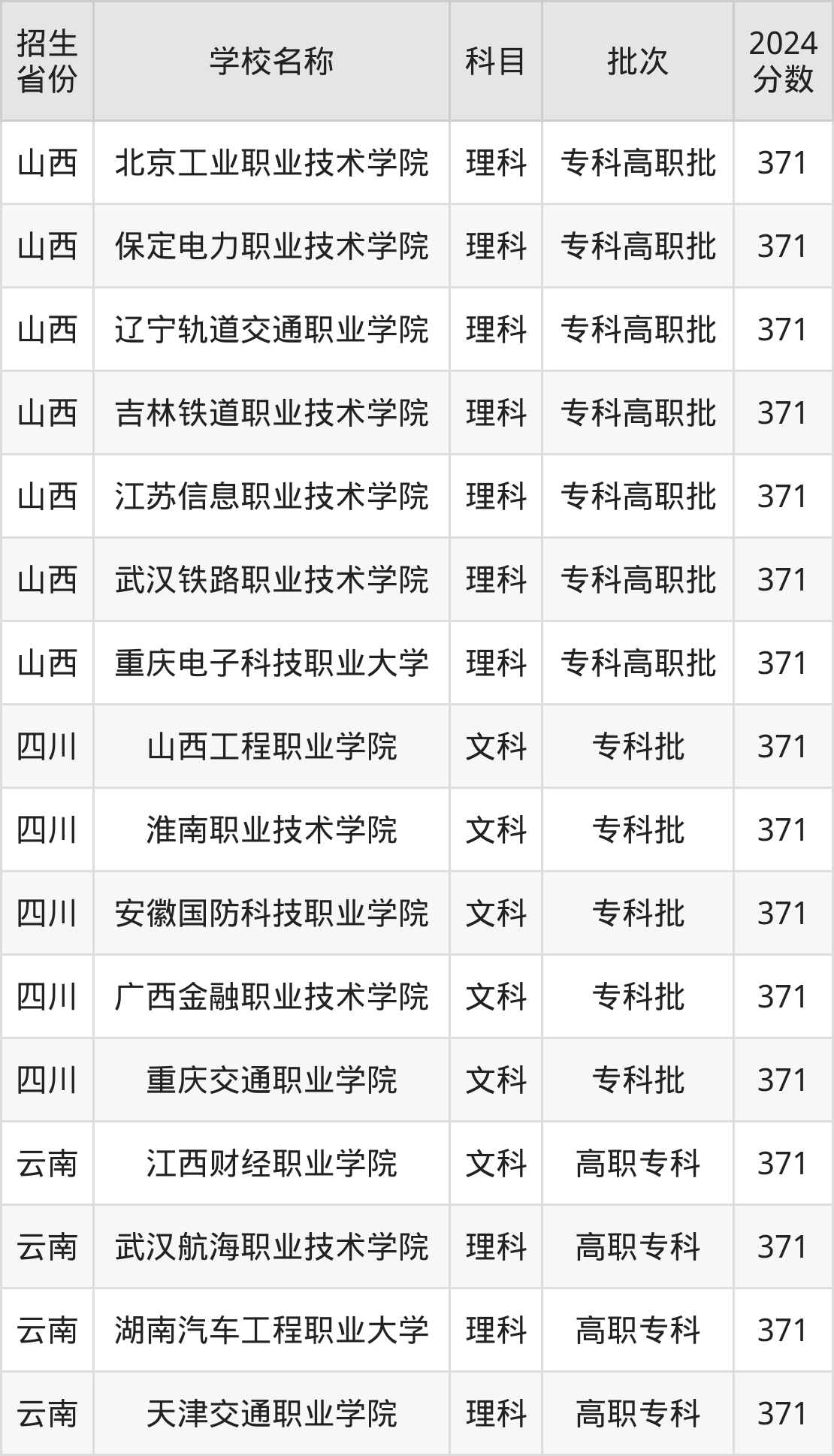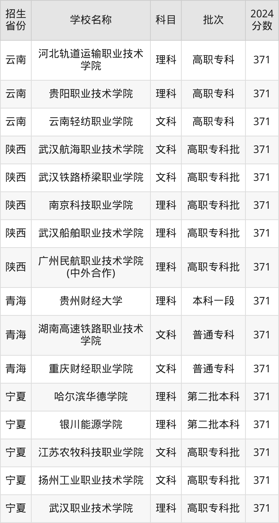 云南省文科分数线是371分的理科大学有:江西财经职业学院、云南轻纺职业学院。