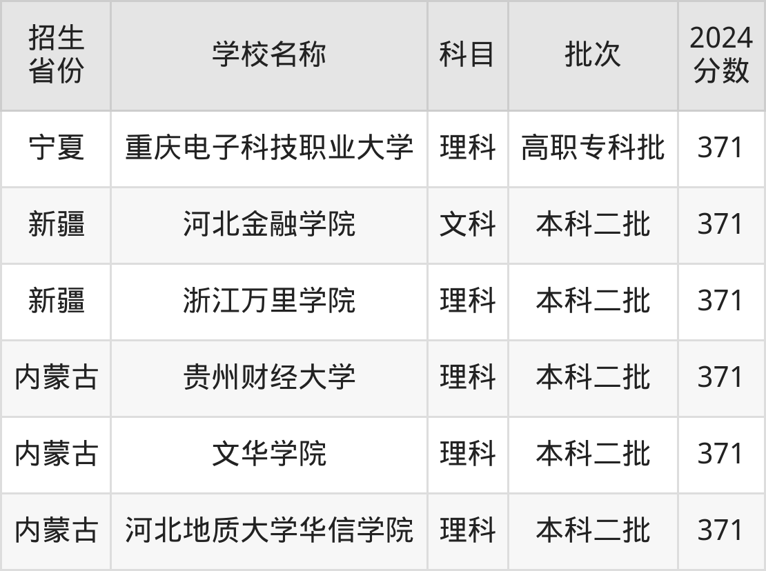 筛选全国各省2024年录取分数线为371分的理科大学如下: