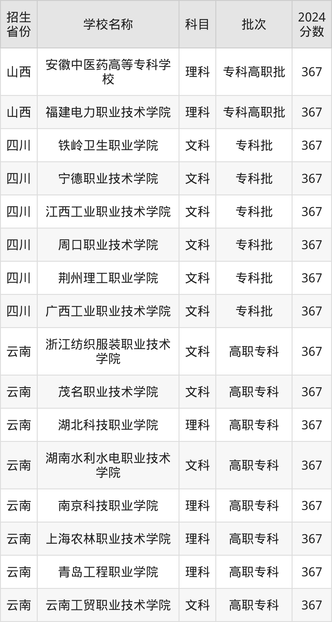 二、各省367分的公办专科大学名单