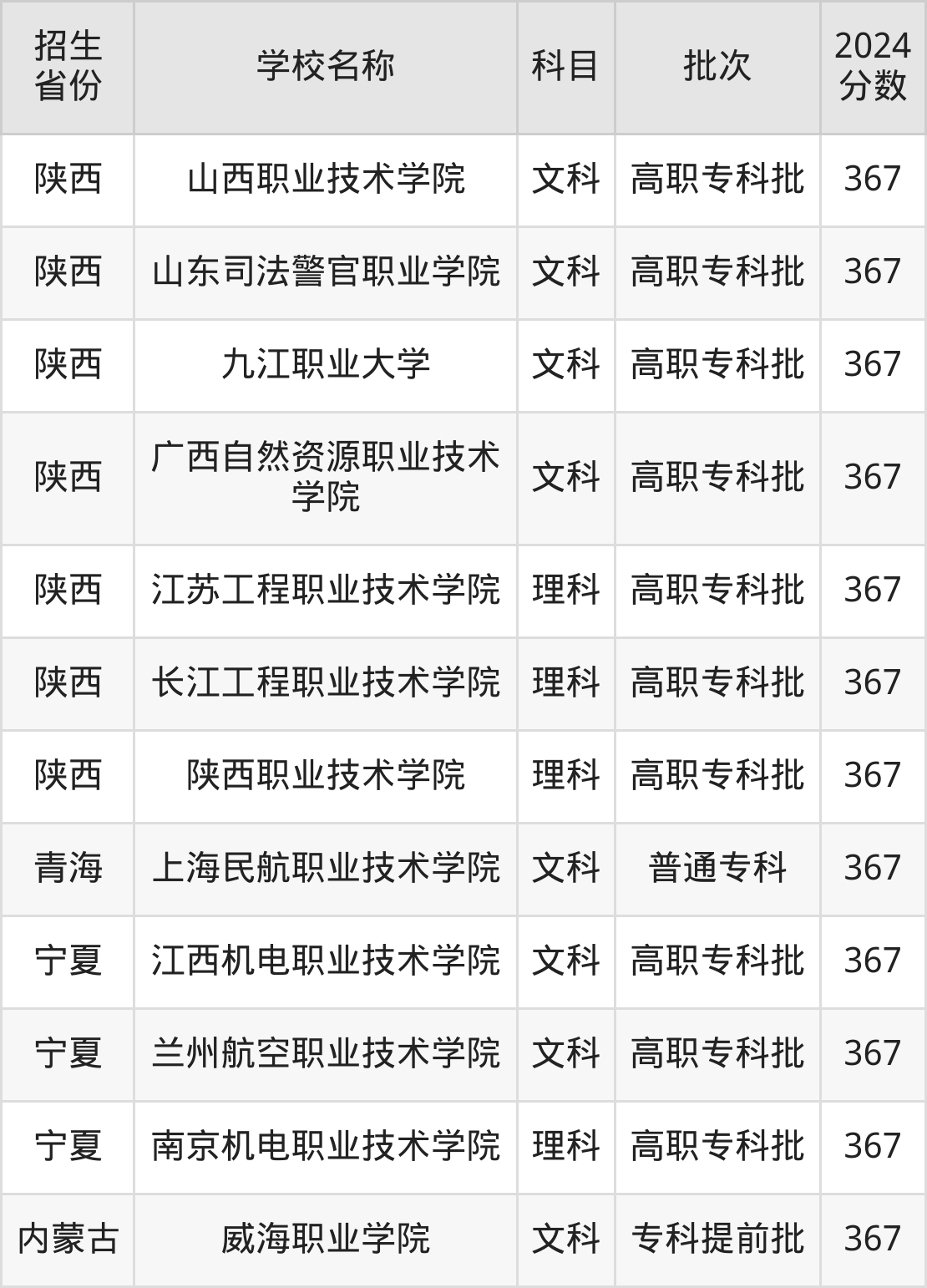 陕西省文科分数线是367分的公办专科大学有:山西职业技术学院、山东司法警官职业学院、九江职业大学、广西自然资源职业技术学院。