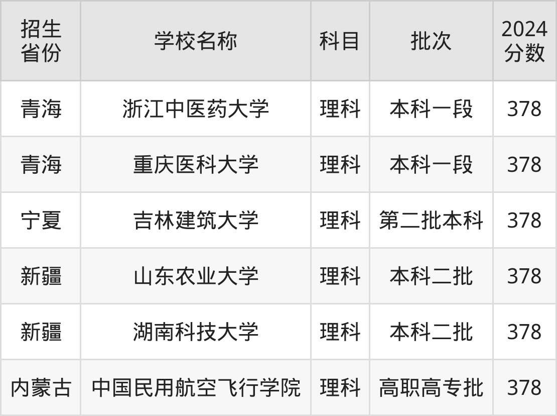 青海省理科分数线是378分的重点大学有:浙江中医药大学、重庆医科大学。